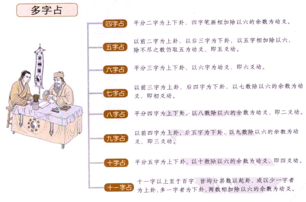 | 梅花易数起卦法最大的特色就是只要有数就可起卦因此,中国文字也可用来起卦。举凡一字二字三字,甚至多字皆可。 测字起卦的步骤与方法 一字占 中国文字可约略分为有偏旁的合体字与不可分割的独体字,所以测字起卦,必须先判断是独体字还是有偏旁的字,若是不可分割的独体字,以其笔划总数平均分之,若笔划为偶数,则各分一半,若为奇数,则以笔划少者为上卦,笔划多者为下卦。若属有偏旁的合体字,可大致分为左右型、上下型、内外型三类。 (1)左右型的字: 如“判”、“搭”、“伴”等字,以左边的笔划数为上卦,右边的笔划数为下卦,再以总笔划数除以六,以余数为动爻数。 (2)上下型的字: 如“雷”、“些”、“奇”等字,以上字笔划为上卦,下字笔划为下卦。 (3)内外型的字: 如“国”、“因”、“问”等字,以外笔划为上卦,内笔划为下卦,总笔划数除以六的余数为动爻数。 二字占 二字占的方法,是以第一字的笔划除以八,余数为上卦;以第二字的笔划除以八,余数为下卦。再以二字的总笔划除以六,以余数为动爻。例如以“发财”二字占问财运,“发”字十二划,除以八余四,震木为上卦,“财”字十划,除以八余二,兑金为下卦。得本卦雷泽归妹,“发财”二字总笔划为二十二,除以六余四,四爻动,得变卦地泽临。上互卦坎水,下互卦离火。 姓名占 姓名占的算法,一般以姓的笔划数除以八,余数为上卦,名的总笔划除以八,余数为下卦。再以姓名总笔划数除以六,得余数为动爻。如“江小海”,“江”字七划,不满八划,不必除以八,直接以七为上卦,故艮七为上卦。“小海”总共十四划,除以八余六,坎六为下卦。姓名总笔划二十一,除以六余三,三爻动,故可得本卦山水蒙,变卦山风蛊。上互卦坤地,下互卦为震雷。 此外,须注意的是以姓名起卦比较特殊,必须以古字型的笔划为准,如①“清”、“河”、“江”等字,皆以四划“水”为部首。②提手旁者,应为“手”部四划。如“抢”、“提”、“捉”③竖心旁者,应为心部四划。如“情”、“怀”、“忆”。 四字占 四字为四象,平分二字为上下卦,四字笔画相加除以六的余数为动爻。 五字占 五字为五行,以前二字为上卦,以后三字为下卦,以五字相加除以六,除 不尽之数仍取五为动爻,即五爻动。 六字占 平分三字为上下卦,以六字为动爻,即六爻动。 七字占 以前三字为上卦,后四字为下卦,以七数除以六的余数为动爻,即初爻动。 八字占 平分四字为上下卦,以八数除以六的余数为动爻,即二爻动。 九字占 以前四字为上卦,后五字为下卦,以九数除以六的余数为动爻,即三爻动。 十字占 平分五字为上下卦,以十数除以六的余数为动爻,即四爻动。 十一字占 十一字以上至于百字,皆均分其数以起卦,或以少一字者为上卦,多一字者为下卦,以两数相加除以六的余数为动爻。 此信息最后更新时间为:2024-10-30 15:37