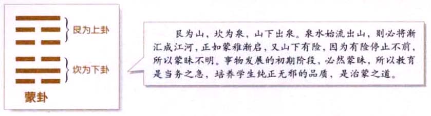 良为山,坎为泉,山下出泉。泉水始流出山,则必将渐汇成江河,正如蒙稚渐启,又山下有险,因为有险停止不前,所以蒙昧不明。事物发展的初期阶段,必然蒙味,所以教育是当务之急,培养学生纯正无邪的品质,是治蒙之道。