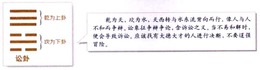 讼卦坎下乾上,与需卦相反。乾为天、坎为水,天西转与水东流背向而行、像人与人之间彼此不和而争辩,讼、争辩。故讼象征争论,含诉讼之义。