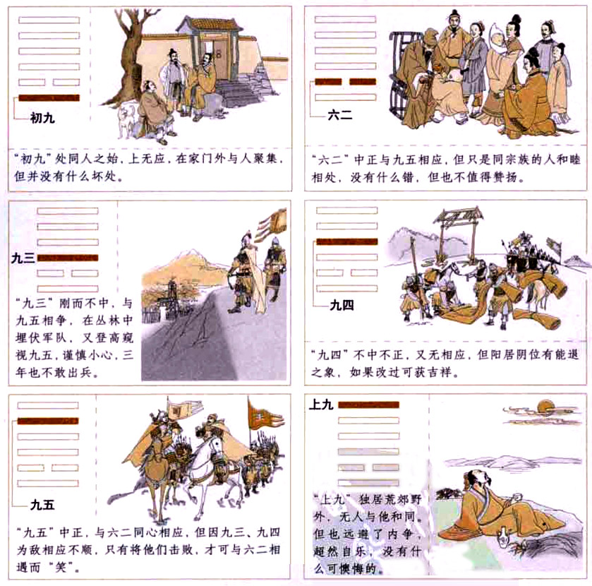 卦义天下为公的大同世界:这一卦,六二柔顺中正,与上卦刚毅中正的“九五”相应,所以称为同人。表示与人和睦相处,必须有广阔无私、光明磊落的境界,做事方能顺利畅通,沟通天下的意志,促成世界大同。而这也是君子的正道。