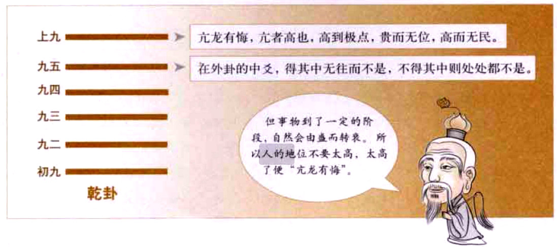 “子曰:贵而无位,高而无民、贤人在下位而无辅,是以动而有悔也。”人到了最高处的时候,便没了位置,高到最后,别人不敢跟你接近,这样就失去了群众,在你的左右旁边,反而没有了真正的人才.这时候高得没有办法再高了,便是最难处。 《易经》每个卦到了最后一爻,阳爻称为“上九”,阴爻称为“上六”,每卦的第一爻为“初”,最后第六爻为“上”。 乾的九五,在外卦而言是中爻,人取其中则是,事物取其中则是,到了顶点则不是,没有出头也不是,所以《易经》告诉我们正中之位。算命看吉凶,就是看是不是得其时,得其中,如得其中位,无往而不是,不得其中则处处都不是。这个中也可读成“仲”的音,如打靶打中了。 到了上九就是亢龙有悔,亢者高也,高到极点,贵而无位,高而无民。中国的哲学,皇帝自称“孤家”、“寡人”,位置到了最高处,就很寂寞,听到的都是好话,会让人听烦了,年纪大了的人谈起话来也常常说:“现在能谈话的人已经没有几个了!”这是“亢龙有悔”,这里的悔不是后悔的悔,是晦气的晦,到这个时候就要倒霉了。换句话说,就是万事不要做绝了,做到了顶,这样就有悔,有痛苦,烦恼就跟着来了。 这一爻表示的状态,在外是指贵而无位,高而无民,也就是虽然很有权利但是脱离了群众的基础;在内是指过于自负,失去了别人的支持。“知进而不知退,知存而不知亡,知得而不知丧”。我们往往把这说成是骄傲的失败,但这更多的是指理想主义者的失败。 “亢龙”,是像一条龙飞到高空。就是太远太远,很远很远的龙。 龙飞升到九天之后,无法再往高处飞升,只剩下两种可能,一是原地不动,另一种是下落。第一种是非常难做到的,所以往往是第二种后果,也就是下落,离开显赫而崇高的位置,悔亦晚矣。但事物到了一定的阶段,就自然会由盛而转衰。所以人的地位不要太高,太高了便“亢龙有悔”。 此信息最后更新时间为:2024-10-31 14:02