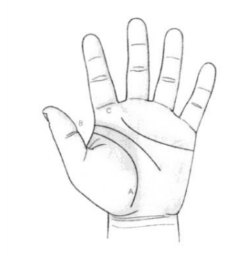 | 3.怎样从女人手相看爱与性格? 人们一般都会说,这世界上的女人只分为两种:漂亮的和不漂亮的。其实,女人是迄今为止地球上性格最复杂的一种动物,从手相学这面镜子就可以对她们水波一样的灵魂,分析出些端倪来。 (2)凌驾于人的女人 大拇指大且粗实的女性,性格强硬,凌驾于男人之上。如果生命线深深地划出一条弧线(A),则是坚韧的女强人。如果加之智慧线起点与生命线相离(B),感情线很长(C),则是像男子般值得依赖的女性。 (4)热情大方的女人 伸手时手指大大地分开,这类人行动积极。如果智慧线起始与生命线相离(A),则大胆,喜欢冒险。如果加之有情欲线(B)和金星环(C),这类女性热情奔放。 (5)精明理性的女人 感情线呈直线延伸到木星丘(A)的人,冷静,精于算计。如果智慧线起始与生命线长长地重叠(B),则为人谨慎、周到。如果加之木星丘上有一条清晰、向上延伸的线(C),则是目标较高、追求名誉地位的女性。 (7)缺少魅力的女人 细纹较少,智慧线延伸到第二火星丘(A)的人,注重实际。如果感情线为一条直线且无支线(B),则有些缺乏女性的温柔和娇媚。