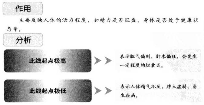 : 第三条线:生命线:反映人体的活力程度精力是否旺盛作用主要反映人体的活力程度,如精力是否旺盛,身体是否处于健康状态等。分析此线起点极高表示胆气偏刚,肝木偏旺,会发生一定程度的胆囊炎。此线起点极低表示人体 ...