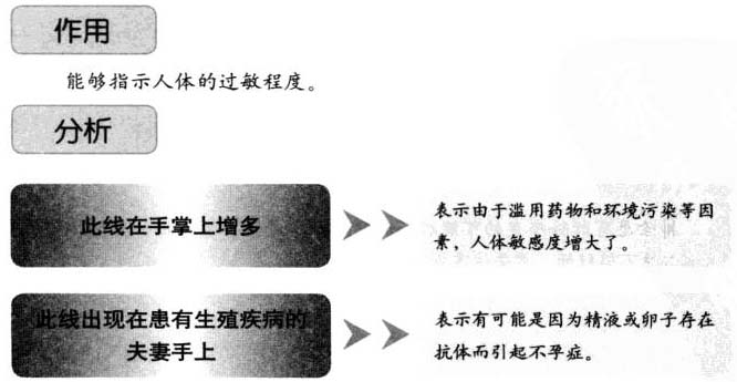 : 第九条线:金星环:主人体的过敏程度作用能够指示人体的过敏程度。分析此线在手掌上增多表示由于滥用药物和环境污染等因素,人体敏感度增大了。此线出现在患有生殖疾病的夫妻手上表示有可能是因为精液或卵子存在抗体 ...