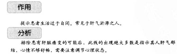 排除患有肝脏癌变的可能后,此线的出现绝大多数是指示其人肝气郁结,心情不够舒畅,需要注意调节心理状态。