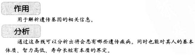 通过这条线可以分析出将会患有哪些遗传疾病。同时也能对其人的基本体质、智力高低、寿命长短有本质的界定。