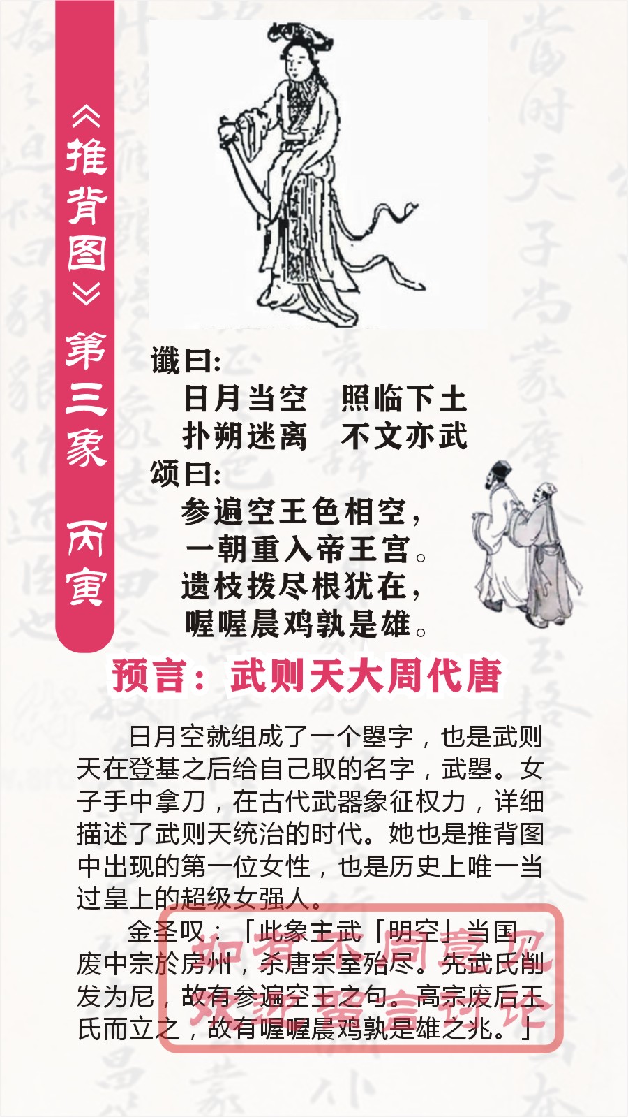 第三象 丙寅艮下乾上遯 谶曰: 日月当空 照临下土 扑朔迷离 不文亦武 颂曰: 参遍空王色相空,一朝重入帝王宫。 遗枝拨尽根犹在,喔喔晨鸡孰是雄。 1. 卦象解读: - 第三象是“丙寅艮下乾上遯”,遯卦象征退避。从卦象上看,乾为天在上,艮为山在下,有山在天下,有退避隐藏之意。这种退避的卦象可能暗示着在这一历史阶段存在着某种势力的隐藏或者后退,为谶语和颂语所描绘的复杂情况埋下伏笔。 2. 谶语解读: 日月当空,照临下土: “日月当空”是一个字谜,组合起来是“曌”字。这是武则天为自己名字造的字,这个字体现了她的称帝野心和统治权威。“照临下土”表示她的统治范围广阔,权力能够覆盖天下。 扑朔迷离,不文亦武: “扑朔迷离”形容事情错综复杂,难以辨别清楚。武则天的身份和统治情况就很复杂。她本是女子(在当时传统观念中女性地位较低),却登上皇位,打破常规。“不文亦武”说明她既有政治手腕(武),又有文化等方面的举措(文)。她重视文化,如在洛阳龙门石窟留下诸多佛像雕刻等文化遗产,同时又以强硬手段镇压反对势力,巩固统治。 3. 颂语解读: 参遍空王色相空,一朝重入帝王宫: “参遍空王色相空”可能是指武则天曾在寺庙修行(她曾入感业寺为尼),经历了宗教生活的洗礼。“一朝重入帝王宫”是说她后来又回到宫中,并且逐步掌握权力,最终称帝。这体现了她人生的巨大转变,从寺庙的清净生活回归到权力斗争的宫廷环境。 遗枝拨尽根犹在,喔喔晨鸡孰是雄: “遗枝拨尽根犹在”可以理解为武则天在掌权过程中,对李唐皇室等反对势力进行了清洗,但李唐皇室的根基(如人心所向等潜在因素)仍然存在。“喔喔晨鸡孰是雄”是一个形象的比喻,在当时以男性为主导的社会观念中,武则天称帝就像母鸡打鸣一样,打破了常规,让人质疑到底谁才是真正的统治者(雄),反映了当时社会对女性称帝这一现象的争议。 4. 整体意义推测: - 这一象主要是在描绘武则天称帝时期的情况。从她独特的名字象征(日月当空),复杂的统治手段(扑朔迷离,不文亦武),到她人生经历的起伏(参遍空王色相空,一朝重入帝王宫),以及她统治下的权力格局(遗枝拨尽根犹在,喔喔晨鸡孰是雄)。这也体现了《推背图》对于特殊历史时期和人物的关注,并且通过隐晦的文字来揭示当时复杂的政治和社会现象。不过,这些解读也是基于后人对历史和《推背图》文字的理解,其原本的意图可能因作者所处时代和观念的限制而有所不同。 第三象:丙寅。艮下乾上,天山遁卦。预言武则天大周代唐。 金圣叹:「此象主武「明空」当国,废中宗於房州,杀唐宗室殆尽。先武氏削发为尼,故有参遍空王之句。高宗废后王氏而立之,故有喔喔晨鸡孰是雄之兆。」 日月空就组成了一个曌字,也是武则天在登基之后给自己取的名字,武曌。所以推背图的第三象又反过来,详细描述了武则天统治的时代。她也是推背图中出现的第一位女性,也是历史上唯一当过皇上的超级女强人。 第1象:(唐朝)甲子 乾下乾上 乾 第2象:(唐朝)乙丑巽下乾上姤(预言武则天称帝) 第3象:(唐朝)丙寅艮下乾上遯(预言武则天造字曌) 第4象:(唐朝)丁卯坤下乾上否(预言张柬之夺回李唐政权) 第5象:(唐朝)戊辰坤下巽上观(预言杨贵妃死于安史之乱) 第6象:(唐朝)已巳坤下艮上剥(预言郭子仪重振大唐) 第7象:(唐朝)庚午震下乾上无妄(吐番部落入寇中原) 第8象:(唐朝)辛未坤下离上晋(李希烈祸乱大唐) 第9象:(唐朝)壬申乾下离上大有(预言黄巢起义) 第10象:(五代)癸酉坎下坎上坎(预言朱温篡唐) 第11象:(五代)申戍兑下坎上节(戏子皇帝后唐庄宗之死) 第12象:(五代)乙亥震下坎上屯(石敬塘割让幽州) 第13象:(五代)丙子离下坎上既济(后周郭威君临天下) 第14象:(五代)丁丑离下兑上革(预言五代终结) 第15象:(北宋)戊寅离下震上丰(宋太祖扫荡群雄) 第16象:(北宋)已卯离下坤上明夷(赵匡胤一统天下) 第17象:(北宋)庚辰坎下坤上师(宋真宗亲征澶渊) 第18象:(北宋)辛巳艮下艮上艮(预言北宋太后刘娥“垂帘听政”) 第19象:(北宋)壬午离下艮上贲(王安石变法) 第20象:(北宋)癸未离下乾上同人(预言蔡京乱政) 第21象:(南宋)甲申兑下艮上损(预言靖康之耻) 第22象:(南宋)乙酉兑下离上睽(康王泥马渡江) 第23象:(南宋)丙戍兑下乾上履(预言蒙古崛起) 第24象:(南宋)丁亥兑下巽上中孚(预言南宋灭亡) 第25象:(元朝)戊子艮下巽上渐(预言元朝国运传10帝) 第26象:(元朝)已丑震下震上震(预言元朝灭亡) 第27象:(明朝)庚寅乾下震上豫(预言明朝开国) 第28象:(明朝)辛卯坎下震上解(预言朱棣篡位) 第29象:(明朝)壬辰巽下震上恒(预言明朝仁宣之治) 第30象:(明朝)癸巳巽下坤上升(预言土木堡之变) 第31象:(明朝)甲午离下巽上家人(预言魏忠贤之乱) 第32象:(明朝)乙未巽下坎上井(预言闯王李自成灭明) 第33象:(清朝)丙申巽下兑上大过(预言清兵入关,传十帝) 第34象:(清朝)丁酉巽下巽上巽(太平天国的预言) 第35象:(清朝)戊戍震下兑上随(火烧圆明园的预言) 第36象:(清朝)己亥乾下巽上小畜(慈喜逃到西安的预言) 第37象:(民国)庚子震下巽上益(建立中华民国的预言) 第38象:(民国)辛丑震下离上噬嗑(第一次世界大战的预言) 第39象:(民国)壬寅巽下兑上颐(日本侵华的预言) 第40象:(近现)癸卯(国家分裂为两岸三地预言) 第41象:(近现)甲辰(文革的预言) 第42象:(近现)乙巳(江青四人帮的预言) 第43象:(近现)