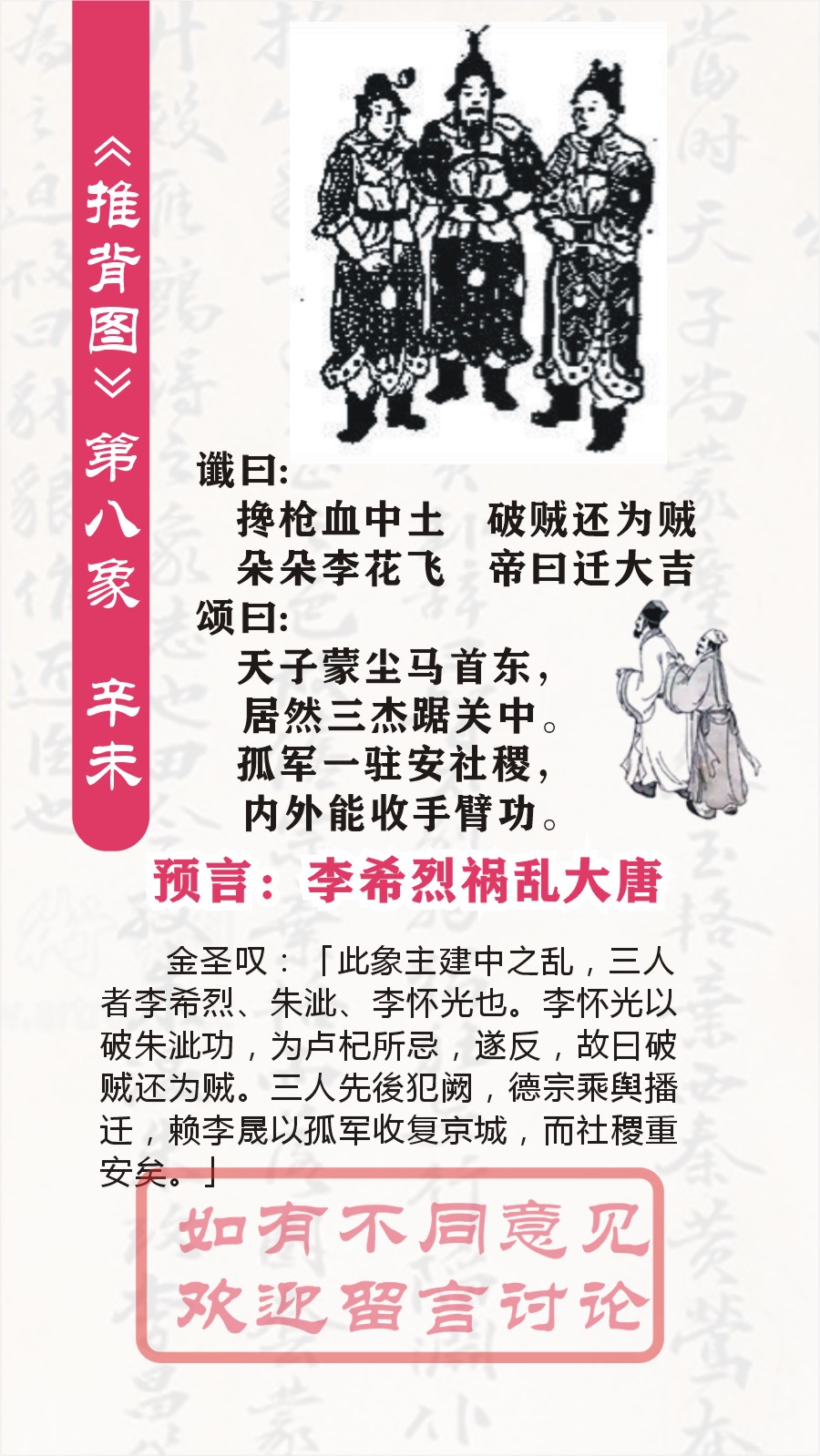 第八象 辛未坤下离上晋 谶曰: 搀枪血中土 破贼还为贼 朵朵李花飞 帝曰迁大吉 颂曰: 天子蒙尘马首东,居然三杰踞关中。 孤军一驻安社稷,内外能收手臂功。 以下是对《推背图》第八象的解读: 卦象解读 “辛未坤下离上晋”,晋卦有晋升、长进之意,象征着光明、发展等积极的趋向。坤为地在下,离为火在上,就像太阳从大地上升起,寓意着一种新生力量的兴起或者局势朝着光明的方向发展变化,为这一象所描述的复杂历史状况铺垫了相应的基调。 谶语解读 搀枪血中土,破贼还为贼: “搀枪”在古代常指代彗星,古人认为彗星出现是不祥之兆,预示着战乱等灾祸,这里可理解为象征着战乱爆发。“血中土”表明战争使得大地染血,也就是造成了大量的人员伤亡,百姓生灵涂炭。“破贼还为贼”意思比较隐晦,可能是说原本打着平定叛乱旗号的一些势力,在过程中却转变立场,自己也变成了制造混乱、为非作歹的一方,反映出当时局势中各方势力复杂多变、立场不坚定的情况。 朵朵李花飞,帝曰迁大吉: “朵朵李花飞”通常被解读为暗指李姓势力,比如李唐皇室或者其他姓李的相关势力在当时四处活动、各展身手。“帝曰迁大吉”可能是说皇帝听从建议进行迁都或者转移等举措,认为这样做会带来好运、有利于局势稳定,暗示当时的皇帝在应对复杂局势时采取了一种主动避让、以求保全的策略。 颂语解读 天子蒙尘马首东,居然三杰踞关中: “天子蒙尘”指皇帝遭遇战乱,被迫离开都城,颠沛流离,处境艰难,“马首东”说明皇帝往东边方向行进。“居然三杰踞关中”提到有三位杰出的人物盘踞在关中地区,这里的“三杰”具体所指并不明确,也许是当时在关中颇具影响力、手握重兵或者有着重要势力的三个人,他们在关中地区形成了一股较强的力量,对局势有着重要影响。 孤军一驻安社稷,内外能收手臂功: “孤军一驻”表示有一支单独的军队驻守在某个关键地方,凭借这支军队的力量来稳定国家局势、保卫社稷,起到了至关重要的作用。“内外能收手臂功”意思是这支军队无论是对内稳定国内局势,还是对外抵御外敌等方面,都能像手臂一样灵活施展力量,发挥积极有效的作用,彰显了其在当时复杂局势下对国家安危的重要贡献。 整体意义推测 第八象整体上是在描述一个局势动荡、战乱频发的历史阶段,先是有战乱带来血腥灾难(搀枪血中土)以及各方势力复杂变化(破贼还为贼)的情况,接着展现出李姓势力活跃(朵朵李花飞)、皇帝采取迁移策略(帝曰迁大吉)等应对之举。同时,颂语中还刻画了皇帝蒙尘、三杰盘踞关中以及某支孤军稳定社稷等不同势力在当时所扮演的角色和发挥的作用,呈现出一幅复杂且多变的历史画面。不过需要明确的是,《推背图》的解读存在诸多主观性,其与具体历史事件的对应也难以确凿证实,仅供参考研究历史文化时使用。 第八象:辛未。坤下离上,火地晋卦。预言李希烈祸乱大唐。 金圣叹:「此象主建中之乱,三人者李希烈、朱泚、李怀光也。李怀光以破朱泚功,为卢杞所忌,遂反,故曰破贼还为贼。三人先後犯阙,德宗乘舆播迁,赖李晟以孤军收复京城,而社稷重安矣。」 第1象:(唐朝)甲子 乾下乾上 乾 第2象:(唐朝)乙丑巽下乾上姤(预言武则天称帝) 第3象:(唐朝)丙寅艮下乾上遯(预言武则天造字曌) 第4象:(唐朝)丁卯坤下乾上否(预言张柬之夺回李唐政权) 第5象:(唐朝)戊辰坤下巽上观(预言杨贵妃死于安史之乱) 第6象:(唐朝)已巳坤下艮上剥(预言郭子仪重振大唐) 第7象:(唐朝)庚午震下乾上无妄(吐番部落入寇中原) 第8象:(唐朝)辛未坤下离上晋(李希烈祸乱大唐) 第9象:(唐朝)壬申乾下离上大有(预言黄巢起义) 第10象:(五代)癸酉坎下坎上坎(预言朱温篡唐) 第11象:(五代)申戍兑下坎上节(戏子皇帝后唐庄宗之死) 第12象:(五代)乙亥震下坎上屯(石敬塘割让幽州) 第13象:(五代)丙子离下坎上既济(后周郭威君临天下) 第14象:(五代)丁丑离下兑上革(预言五代终结) 第15象:(北宋)戊寅离下震上丰(宋太祖扫荡群雄) 第16象:(北宋)已卯离下坤上明夷(赵匡胤一统天下) 第17象:(北宋)庚辰坎下坤上师(宋真宗亲征澶渊) 第18象:(北宋)辛巳艮下艮上艮(预言北宋太后刘娥“垂帘听政”) 第19象:(北宋)壬午离下艮上贲(王安石变法) 第20象:(北宋)癸未离下乾上同人(预言蔡京乱政) 第21象:(南宋)甲申兑下艮上损(预言靖康之耻) 第22象:(南宋)乙酉兑下离上睽(康王泥马渡江) 第23象:(南宋)丙戍兑下乾上履(预言蒙古崛起) 第24象:(南宋)丁亥兑下巽上中孚(预言南宋灭亡) 第25象:(元朝)戊子艮下巽上渐(预言元朝国运传10帝) 第26象:(元朝)已丑震下震上震(预言元朝灭亡) 第27象:(明朝)庚寅乾下震上豫(预言明朝开国) 第28象:(明朝)辛卯坎下震上解(预言朱棣篡位) 第29象:(明朝)壬辰巽下震上恒(预言明朝仁宣之治) 第30象:(明朝)癸巳巽下坤上升(预言土木堡之变) 第31象:(明朝)甲午离下巽上家人(预言魏忠贤之乱) 第32象:(明朝)乙未巽下坎上井(预言闯王李自成灭明) 第33象:(清朝)丙申巽下兑上大过(预言清兵入关,传十帝) 第34象:(清朝)丁酉巽下巽上巽(太平天国的预言) 第35象:(清朝)戊戍震下兑上随(火烧圆明园的预言) 第36象:(清朝)己亥乾下巽上小畜(慈喜逃到西安的预言) 第37象:(民国)庚子震下巽上益(建立中华民国的预言) 第38象:(民国)辛丑震下离上噬嗑(第一次世界大战的预言) 第39象:(民国)壬寅巽下
