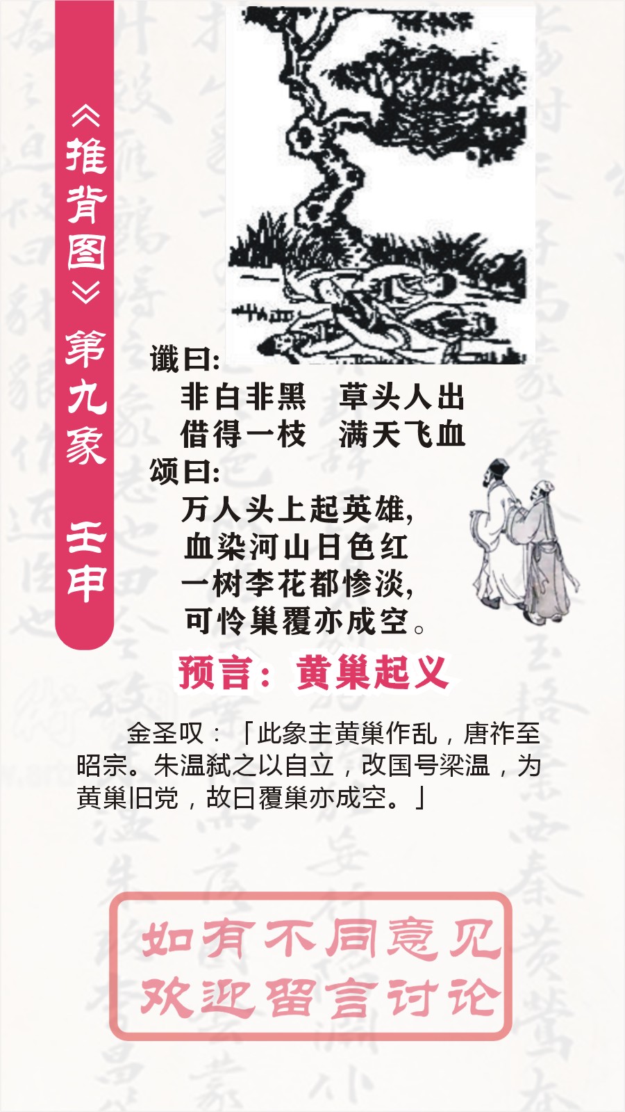 第九象 壬申乾下离上大有 谶曰: 非白非黑 草头人出 借得一枝 满天飞血 颂曰: 万人头上起英雄,血染河山日色红。 一树李花都惨淡,可怜巢覆亦成空。 以下是对《推背图》第九象的解读: 卦象解读 “壬申乾下离上大有”,大有卦象征着大有收获、盛大丰有等意,从卦象来看,乾为天在下,离为火在上,就如同太阳高悬天空,光芒普照大地,寓意着一种蓬勃发展、影响广泛的态势,但结合谶语和颂语所描述的内容来看,这种看似盛大的局面背后可能隐藏着诸多动荡与血腥之事。 谶语解读 非白非黑,草头人出: “非白非黑”表意比较模糊,一种可能的理解是局势处于一种混沌不清、难以简单用是非善恶去界定的状态。“草头人出”通常被认为是暗指姓氏中带有草字头的人物出现,比如“黄”姓等(只是一种常见推测,并不确定),预示着会有这样一位关键人物登上历史舞台,对局势产生重大影响。 借得一枝,满天飞血: “借得一枝”或许意味着这个人借助了某股势力或者某个依托得以兴起、发展,“满天飞血”则形象地描绘出其出现后引发了大规模的血腥战乱,使得整个天下都陷入到血雨腥风之中,可见这个人带来的不是和平与安宁,而是剧烈的动荡和残酷的厮杀。 颂语解读 万人头上起英雄,血染河山日色红: “万人头上起英雄”可以理解为在众多百姓之上崛起了一位所谓的“英雄”,强调这个人有着较大的影响力和较高的地位,能够凌驾于众人之上。“血染河山日色红”则进一步渲染了其引发的战乱之惨烈,鲜血染红了山河大地,连太阳的颜色似乎都被映衬得更红了,突出了战争造成的血腥和破坏程度之深。 一树李花都惨淡,可怜巢覆亦成空: “一树李花都惨淡”很明显是暗指李唐皇室,意味着在这场由那位关键人物引发的动荡中,李唐皇室受到了极大冲击,处境艰难,往日的辉煌不再,变得惨淡凄凉。“可怜巢覆亦成空”用鸟巢倾覆、一切成空的比喻,形象地说明李唐皇室最终可能走向覆灭,所有的荣华富贵、统治根基都烟消云散,呈现出一种衰败、悲凉的结局。 整体意义推测 第九象整体上似乎是在描绘一个特定历史时期,先是出现了一位身份特殊(草头人出)且带来混沌局势(非白非黑)的关键人物,他借助一定依托(借得一枝)后掀起了大规模血腥战乱(满天飞血),在这个过程中,对李唐皇室造成了毁灭性打击(一树李花都惨淡,可怜巢覆亦成空),让天下陷入到一片混乱和凄惨的状态之中。不过,《推背图》本身充满神秘色彩,其解读具有很强的主观性,与具体历史事件的对应也难以确切考证,仅供参考研究历史文化时使用。 需理性看待 《推背图》作为一部蕴含诸多隐晦内容的古籍,虽然其文字表述往往能引发人们诸多联想,试图与历史事件相契合,但它并非严谨的史学著作,其中所体现的“预言”性质也缺乏科学依据来验证。我们应当以理性、客观的态度去看待它,将其更多地作为了解古人思维方式、历史文化观念以及探究历史演变脉络的一种参考资料。 第九象:壬申。乾下离上,火天大有卦。预言黄巢起义。 金圣叹:「此象主黄巢作乱,唐祚至昭宗。朱温弑之以自立,改国号梁温,为黄巢旧党,故曰覆巢亦成空。」 第1象:(唐朝)甲子 乾下乾上 乾 第2象:(唐朝)乙丑巽下乾上姤(预言武则天称帝) 第3象:(唐朝)丙寅艮下乾上遯(预言武则天造字曌) 第4象:(唐朝)丁卯坤下乾上否(预言张柬之夺回李唐政权) 第5象:(唐朝)戊辰坤下巽上观(预言杨贵妃死于安史之乱) 第6象:(唐朝)已巳坤下艮上剥(预言郭子仪重振大唐) 第7象:(唐朝)庚午震下乾上无妄(吐番部落入寇中原) 第8象:(唐朝)辛未坤下离上晋(李希烈祸乱大唐) 第9象:(唐朝)壬申乾下离上大有(预言黄巢起义) 第10象:(五代)癸酉坎下坎上坎(预言朱温篡唐) 第11象:(五代)申戍兑下坎上节(戏子皇帝后唐庄宗之死) 第12象:(五代)乙亥震下坎上屯(石敬塘割让幽州) 第13象:(五代)丙子离下坎上既济(后周郭威君临天下) 第14象:(五代)丁丑离下兑上革(预言五代终结) 第15象:(北宋)戊寅离下震上丰(宋太祖扫荡群雄) 第16象:(北宋)已卯离下坤上明夷(赵匡胤一统天下) 第17象:(北宋)庚辰坎下坤上师(宋真宗亲征澶渊) 第18象:(北宋)辛巳艮下艮上艮(预言北宋太后刘娥“垂帘听政”) 第19象:(北宋)壬午离下艮上贲(王安石变法) 第20象:(北宋)癸未离下乾上同人(预言蔡京乱政) 第21象:(南宋)甲申兑下艮上损(预言靖康之耻) 第22象:(南宋)乙酉兑下离上睽(康王泥马渡江) 第23象:(南宋)丙戍兑下乾上履(预言蒙古崛起) 第24象:(南宋)丁亥兑下巽上中孚(预言南宋灭亡) 第25象:(元朝)戊子艮下巽上渐(预言元朝国运传10帝) 第26象:(元朝)已丑震下震上震(预言元朝灭亡) 第27象:(明朝)庚寅乾下震上豫(预言明朝开国) 第28象:(明朝)辛卯坎下震上解(预言朱棣篡位) 第29象:(明朝)壬辰巽下震上恒(预言明朝仁宣之治) 第30象:(明朝)癸巳巽下坤上升(预言土木堡之变) 第31象:(明朝)甲午离下巽上家人(预言魏忠贤之乱) 第32象:(明朝)乙未巽下坎上井(预言闯王李自成灭明) 第33象:(清朝)丙申巽下兑上大过(预言清兵入关,传十帝) 第34象:(清朝)丁酉巽下巽上巽(太平天国的预言) 第35象:(清朝)戊戍震下兑上随(火烧圆明园的预言) 第36象:(清朝)己亥乾下巽上小畜(慈喜逃到西安的预言) 第37象:(民国)庚子震下巽上益(建立中华民国的预言) 第38象:(民国)辛丑震下离上噬嗑(第一次世界大战的预言) 第39象:(民国)壬寅