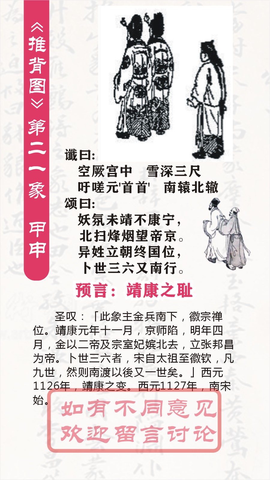 第二一象 甲申兑下艮上损 谶曰: 空厥宫中 雪深三尺 吁嗟元'首首' 南辕北辙 颂曰: 妖氛未靖不康宁,北扫烽烟望帝京。 异姓立朝终国位,卜世三六又南行。 以下是对《推背图》第二十一象的解读: 卦象解读 “甲申兑下艮上损”,损卦象征着减损,有自损、受损之意,也暗示着在事物发展过程中会出现损耗、损失的情况,需要通过一定的方式去调整、弥补。兑为泽在下,艮为山在上,犹如泽水侵蚀山体,造成山体有所减损,为这一象所描述的内容营造出一种有所损耗、面临不利变化的氛围。 谶语解读 空厥宫中,雪深三尺: “空厥宫中”形象地描绘出宫殿之中变得空空荡荡的情景,可能意味着宫廷内发生了变故,比如皇帝出逃、被废或者遭遇重大变故导致人员离散,宫廷失去了往日的繁华与生机。“雪深三尺”一方面是一种景象描写,营造出寒冷、孤寂、凄凉的氛围;另一方面也可能寓意着当时的局势严峻、冰冷,让宫廷乃至整个国家都陷入到艰难的境地,就像被厚厚的积雪覆盖一样,难以摆脱困境。 吁嗟元首,南辕北辙: “吁嗟元首”表达出对最高统治者(元首)的一种叹息、惋惜之情,说明这位统治者的处境不佳或者做出的决策等存在问题。“南辕北辙”是一个成语,原指行动与目的相反,在这里或许暗示统治者的行为、举措与期望达到的目标背道而驰,导致国家的发展走向了错误的方向,陷入到更加混乱、不利的局面之中。 颂语解读 妖氛未靖不康宁,北扫烽烟望帝京: “妖氛未靖不康宁”表明当时社会不安定的因素(妖氛)还没有被清除,国家依然处于不太平、不安宁的状态,局势动荡,百姓生活也难以安稳。“北扫烽烟望帝京”描绘出军队向北方去平息战乱(扫烽烟),同时心系着京城的情况,体现出对国家核心地带稳定的重视以及想要恢复京城安宁、平定北方战乱的决心,但也从侧面反映出当时北方局势的紧张以及对整个国家局势影响之大。 异姓立朝终国位,卜世三六又南行: “异姓立朝终国位”意思是有不同姓氏的人在朝廷中最终占据了重要的统治地位,暗示出现了政权更迭,原本的皇室家族失去了掌控权,由异姓之人取而代之,这是一种重大的政治变动。“卜世三六又南行”较难确切解释,一种可能的理解是通过占卜等方式预测国运,“三六”或许象征着一定的时间周期或者其他相关寓意,“又南行”也许表示后续又有往南方发展、变动等情况发生,整体体现出政权交替后国家运势及发展方向的变化。 整体意义推测 第二十一象整体上似乎是在描绘一个国家处于动荡、变迁的历史阶段,先是宫廷发生变故、变得空虚凄凉(空厥宫中,雪深三尺),统治者决策失误导致局势恶化(吁嗟元首,南辕北辙)。接着社会依旧不安宁,北方有战乱需去平定(妖氛未靖不康宁,北扫烽烟望帝京),而后还出现了异姓夺取政权以及后续运势和发展方向改变等情况(异姓立朝终国位,卜世三六又南行),呈现出一幅局势复杂、政权更迭、国家命运多变的历史画面。不过,《推背图》的解读具有很强的主观性,很难确切地与具体历史事件一一对应,其真实性也缺乏科学依据,仅供参考研究历史文化时使用。 需理性看待 我们要清醒地认识到《推背图》是一部有着神秘色彩和诸多争议的古籍,其文字所蕴含的内容多被后人从不同角度揣摩、解读,所谓的“预言”并不能用科学方法来验证。我们要秉持理性客观的态度,把它当作了解古代文化、古人思维以及探究历史发展脉络的一种参考资料,避免过度迷信和不切实际的联想。 第二十一象:甲申。兑下艮上,山泽损卦。预言靖康之耻。 圣叹:「此象主金兵南下,徽宗禅位。靖康元年十一月,京师陷,明年四月,金以二帝及宗室妃嫔北去,立张邦昌为帝。卜世三六者,宋自太祖至徽钦,凡九世,然则南渡以後又一世矣。」西元1126年,靖康之变。西元1127年,南宋始。 第1象:(唐朝)甲子 乾下乾上 乾 第2象:(唐朝)乙丑巽下乾上姤(预言武则天称帝) 第3象:(唐朝)丙寅艮下乾上遯(预言武则天造字曌) 第4象:(唐朝)丁卯坤下乾上否(预言张柬之夺回李唐政权) 第5象:(唐朝)戊辰坤下巽上观(预言杨贵妃死于安史之乱) 第6象:(唐朝)已巳坤下艮上剥(预言郭子仪重振大唐) 第7象:(唐朝)庚午震下乾上无妄(吐番部落入寇中原) 第8象:(唐朝)辛未坤下离上晋(李希烈祸乱大唐) 第9象:(唐朝)壬申乾下离上大有(预言黄巢起义) 第10象:(五代)癸酉坎下坎上坎(预言朱温篡唐) 第11象:(五代)申戍兑下坎上节(戏子皇帝后唐庄宗之死) 第12象:(五代)乙亥震下坎上屯(石敬塘割让幽州) 第13象:(五代)丙子离下坎上既济(后周郭威君临天下) 第14象:(五代)丁丑离下兑上革(预言五代终结) 第15象:(北宋)戊寅离下震上丰(宋太祖扫荡群雄) 第16象:(北宋)已卯离下坤上明夷(赵匡胤一统天下) 第17象:(北宋)庚辰坎下坤上师(宋真宗亲征澶渊) 第18象:(北宋)辛巳艮下艮上艮(预言北宋太后刘娥“垂帘听政”) 第19象:(北宋)壬午离下艮上贲(王安石变法) 第20象:(北宋)癸未离下乾上同人(预言蔡京乱政) 第21象:(南宋)甲申兑下艮上损(预言靖康之耻) 第22象:(南宋)乙酉兑下离上睽(康王泥马渡江) 第23象:(南宋)丙戍兑下乾上履(预言蒙古崛起) 第24象:(南宋)丁亥兑下巽上中孚(预言南宋灭亡) 第25象:(元朝)戊子艮下巽上渐(预言元朝国运传10帝) 第26象:(元朝)已丑震下震上震(预言元朝灭亡) 第27象:(明朝)庚寅乾下震上豫(预言明朝开国) 第28象:(明朝)辛