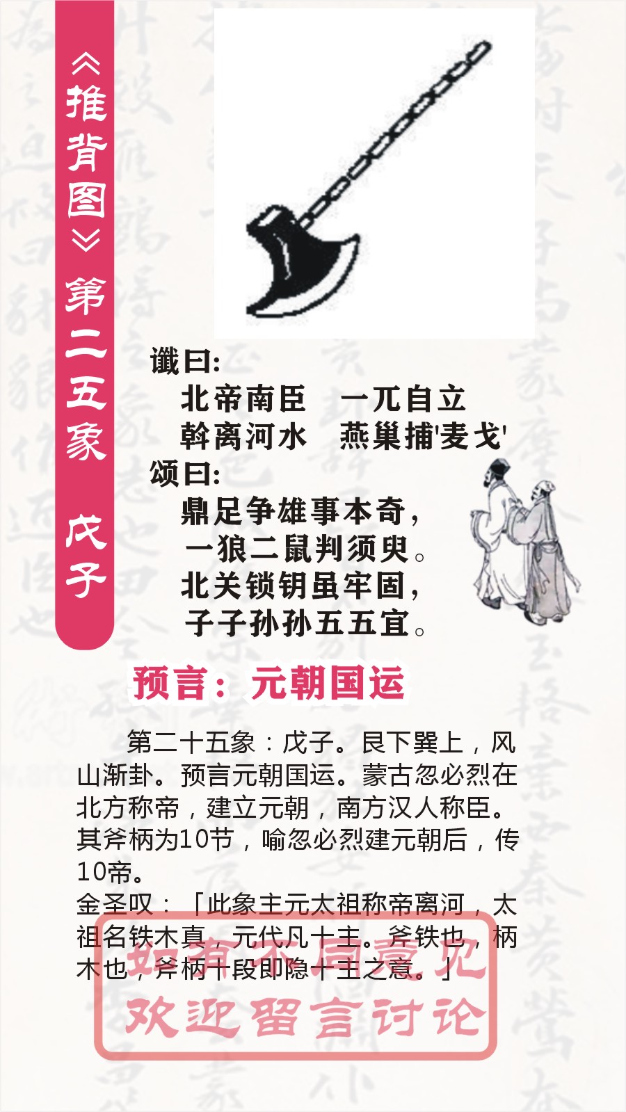 | 〓〓〓《推背图》(图文全解)〓〓〓 第二五象 戊子艮下巽上渐 谶曰: 北帝南臣 一兀自立 斡离河水 燕巢捕'麦戈' 颂曰: 鼎足争雄事本奇,一狼二鼠判须臾。 北关锁钥虽牢固,子子孙孙五五宜。 以下是对《推背图》第二十五象的解读: 卦象解读 “戊子艮下巽上渐”,渐卦象征着渐进、逐步发展之意,就像事物是一步一步、循序渐进地变化,有按部就班、稳步前行的含义。艮为山在下,巽为风在上,风在山上缓缓吹拂,寓意着一种温和且持续的推动力量,为这一象所描述的历史阶段营造出一种逐步演进、缓慢变化的氛围。 谶语解读 北帝南臣,一兀自立: “北帝南臣”描绘出一种南北不同的政治格局,北方存在着处于统治地位的帝王,而南方则处于臣属的地位,体现出一种地域上的权力分化与等级关系。“一兀自立”从字谜角度看,“一兀”合起来是个“元”字,可能暗指元朝,意味着元朝崛起并且建立起自己独立的政权,有割据一方乃至统一北方等情况出现,展示出当时北方势力的兴起与发展态势。 斡离河水,燕巢捕麥戈: “斡离河水”中的斡离河,可能是特定的一条河,它或许象征着某个地域或者相关势力的依托所在,也许此地发生了一些重要的事件或者有着关键的军事行动等。“燕巢捕麥戈”较难确切解释,一种可能是“麥戈”组成“戟”字,“燕巢捕戟”表意比较隐晦,也许意味着在燕京(今北京一带)地区发生了一些涉及兵器、争斗之类的情况,反映出当地局势的紧张与不稳定,比如可能遭遇战乱、被争夺等状况。 颂语解读 鼎足争雄事本奇,一狼二鼠判须臾: “鼎足争雄”表明当时存在着三方势力相互争斗、角逐天下的局面,像鼎的三足一样形成一种平衡又竞争的态势,这种局势本身是比较奇特、复杂的。“一狼二鼠判须臾”运用比喻手法,把三方势力分别比作“一狼”和“二鼠”,形象地体现出三方力量强弱有别,而且局势变化很快(判须臾),可能在短时间内就能决出胜负或者出现势力强弱的明显变化,凸显出当时争雄局面的激烈与瞬息万变。 北关锁钥虽牢固,子子孙孙五五宜: “北关锁钥虽牢固”说明北方的关隘等防御设施很坚固,有着较强的军事防御能力,是守护北方的重要屏障。“子子孙孙五五宜”含义较隐晦,一种可能是与家族传承、繁衍以及某种规则或数量上的寓意有关,也许暗示着北方的相关势力在后续的发展中,其子孙后代按照一定的方式或者数量布局等,会有比较适宜、顺利的发展态势,不过具体所指不太明确,存在多种解读的可能性。 整体意义推测 第二十五象整体上大概是在描绘一个特定历史时期,先是呈现出南北不同的政治格局以及元朝势力崛起(北帝南臣,一兀自立),同时在相关地域有重要的河流及燕京地区局势紧张等情况发生(斡离河水,燕巢捕麥戈)。接着出现三方势力鼎足争雄且变化迅速的局面(鼎足争雄事本奇,一狼二鼠判须臾),而北方有着牢固的防御(北关锁钥虽牢固),其势力的后续发展在子孙繁衍等方面似乎也有着某种适宜的安排(子子孙孙五五宜),呈现出一幅局势复杂、多方争雄且地域特色明显的历史画面。不过,《推背图》的解读具有较强主观性,很难精准对应具体历史事件,仅供参考研究历史文化时使用。 需理性看待 我们应认识到《推背图》是一部有着神秘色彩的古籍,其内容多是后人不断揣摩、解读的对象,所谓的“预言”并不能被科学所验证。我们要以理性客观的态度去看待它,把它当作了解古代文化、古人思维以及历史演变脉络的一种参考资料,避免过度迷信和不切实际的联想。 第二十五象:戊子。艮下巽上,风山渐卦。预言元朝国运。蒙古忽必烈在北方称帝,建立元朝,南方汉人称臣。其斧柄为10节,喻忽必烈建元朝后,传10帝。 金圣叹:「此象主元太祖称帝离河,太祖名铁木真,元代凡十主。斧铁也,柄木也,斧柄十段即隐十主之意。」