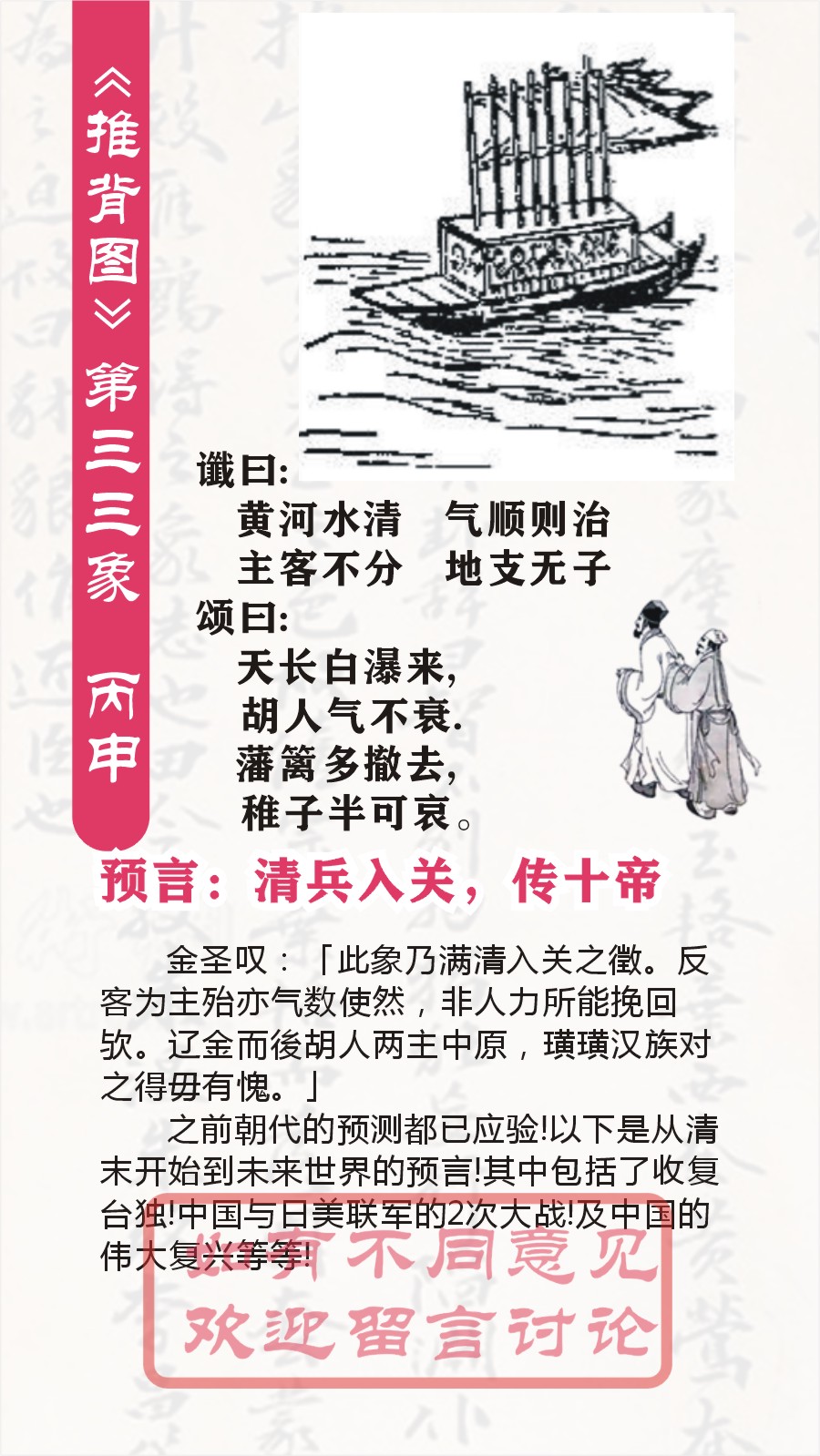 第三三象 丙申巽下兑上大过 谶曰: 黄河水清 气顺则治 主客不分 地支无子 颂曰: 天长白瀑来,胡人气不衰。 藩篱多撤去,稚子半可哀。 以下是对《推背图》第三十三象的解读: 卦象解读 “丙申巽下兑上大过”,大过卦象征着大为过越,有过度、超出常规之意,往往意味着事物的发展出现了一些极端的、不同寻常的情况,可能面临着较大的危机或者需要采取特殊的方式去应对。巽为风在下,兑为泽在上,就好像大风刮过湖面,掀起巨大的波澜,预示着这一象所描述的历史阶段将会出现打破常规、动荡不安的状况。 谶语解读 黄河水清,气顺则治: “黄河水清”在古代被视为一种极为罕见的祥瑞之兆,寓意着天下将会出现太平、清明的景象,意味着原本浑浊、难以治理的状况(黄河常象征着复杂、难控的局面)会变得清晰有序,国家有望走向良好的治理状态,实现安定繁荣,前提是“气顺”,也就是社会的风气、运势等各方面都顺畅和谐,才能达成这样理想的治理局面。 主客不分,地支无子: “主客不分”表意较隐晦,可能暗示在当时的局势中,本土势力与外来势力(主客)之间的界限变得模糊,或者在应对各种事务时,主次、主动被动的关系混乱不清,导致局面变得复杂难控。“地支无子”从传统的干支纪年角度看,地支有十二,无子可能意味着一种缺失、不完整,也许象征着在某个方面出现了漏洞、欠缺,对整个局势发展产生不利影响,具体所指不太明确,不过总体体现出一种不正常、违背常理的状态,预示着局势存在隐患。 颂语解读 天长白瀑来,胡人气不衰: “天长白瀑来”营造出一种宏大、壮观且带有一定神秘色彩的景象,可能象征着远方有一些不同寻常的情况出现,像是从天而降的白色瀑布一样,有着强大的冲击力和影响力。“胡人气不衰”明确指出外族(胡人)的势力依然强盛,没有衰落的迹象,说明当时面临着持续的外族威胁,边疆地区可能长期处于紧张的对峙或者战乱状态,外族对中原地区一直保持着较大的压力。 藩篱多撤去,稚子半可哀: “藩篱多撤去”意味着原本用来防御、阻隔的屏障(藩篱可指代边境的防御工事、政策等)被大量拆除,使得国家的防御变得薄弱,容易遭受外敌的侵扰,这也从侧面反映出当时可能由于一些内部或外部的原因,在边防策略等方面出现了问题。“稚子半可哀”则将视角转向普通百姓中的孩童,“半可哀”体现出一种令人悲哀的状态,也许是说在这样的局势下,年幼的孩子遭受战乱、外族侵扰等苦难,生活充满了悲哀与不幸,凸显出百姓因局势动荡而承受的痛苦。 整体意义推测 第三十三象整体上大概是在描绘一个局势复杂、存在诸多隐患且面临外族威胁的历史阶段,先是出现了黄河水清这样象征祥瑞但需气顺才能实现良好治理的情况(黄河水清,气顺则治),同时局势中又存在主客不分、地支无子等不合理、有隐患的状况(主客不分,地支无子)。接着远方有异常情况出现,外族势力强盛不衰(天长白瀑来,胡人气不衰),而且国家边防削弱,百姓尤其是孩童受苦(藩篱多撤去,稚子半可哀),呈现出一幅内忧外患、动荡不安、百姓遭殃的历史画面。不过,《推背图》的解读具有较强主观性,很难精准对应具体历史事件,仅供参考研究历史文化时使用。 需理性看待 我们应认识到《推背图》是一部有着神秘色彩的古籍,其内容多是后人不断揣摩、解读的对象,所谓的“预言”并不能被科学所验证。我们要以理性客观的态度去看待它,把它当作了解古代文化、古人思维以及历史演变脉络的一种参考资料,避免过度迷信和不切实际的联想。 第三十三象:丙申。巽下兑上,泽风大过卦。预言清兵入关,传十帝。 金圣叹:「此象乃满清入关之徵。反客为主殆亦气数使然,非人力所能挽回欤。辽金而後胡人两主中原,璜璜汉族对之得毋有愧。」 之前朝代的预测都已应验!以下是从清末开始到未来世界的预言!其中包括了收复台独!中国与日美联军的2次大战!胡温的英明领导及中国的伟大复兴等等!!) 第1象:(唐朝)甲子 乾下乾上 乾 第2象:(唐朝)乙丑巽下乾上姤(预言武则天称帝) 第3象:(唐朝)丙寅艮下乾上遯(预言武则天造字曌) 第4象:(唐朝)丁卯坤下乾上否(预言张柬之夺回李唐政权) 第5象:(唐朝)戊辰坤下巽上观(预言杨贵妃死于安史之乱) 第6象:(唐朝)已巳坤下艮上剥(预言郭子仪重振大唐) 第7象:(唐朝)庚午震下乾上无妄(吐番部落入寇中原) 第8象:(唐朝)辛未坤下离上晋(李希烈祸乱大唐) 第9象:(唐朝)壬申乾下离上大有(预言黄巢起义) 第10象:(五代)癸酉坎下坎上坎(预言朱温篡唐) 第11象:(五代)申戍兑下坎上节(戏子皇帝后唐庄宗之死) 第12象:(五代)乙亥震下坎上屯(石敬塘割让幽州) 第13象:(五代)丙子离下坎上既济(后周郭威君临天下) 第14象:(五代)丁丑离下兑上革(预言五代终结) 第15象:(北宋)戊寅离下震上丰(宋太祖扫荡群雄) 第16象:(北宋)已卯离下坤上明夷(赵匡胤一统天下) 第17象:(北宋)庚辰坎下坤上师(宋真宗亲征澶渊) 第18象:(北宋)辛巳艮下艮上艮(预言北宋太后刘娥“垂帘听政”) 第19象:(北宋)壬午离下艮上贲(王安石变法) 第20象:(北宋)癸未离下乾上同人(预言蔡京乱政) 第21象:(南宋)甲申兑下艮上损(预言靖康之耻) 第22象:(南宋)乙酉兑下离上睽(康王泥马渡江) 第23象:(南宋)丙戍兑下乾上履(预言蒙古崛起) 第24象:(南宋)丁亥兑下巽上中孚(预言南宋灭亡) 第25象:(元朝)戊子艮下巽上
