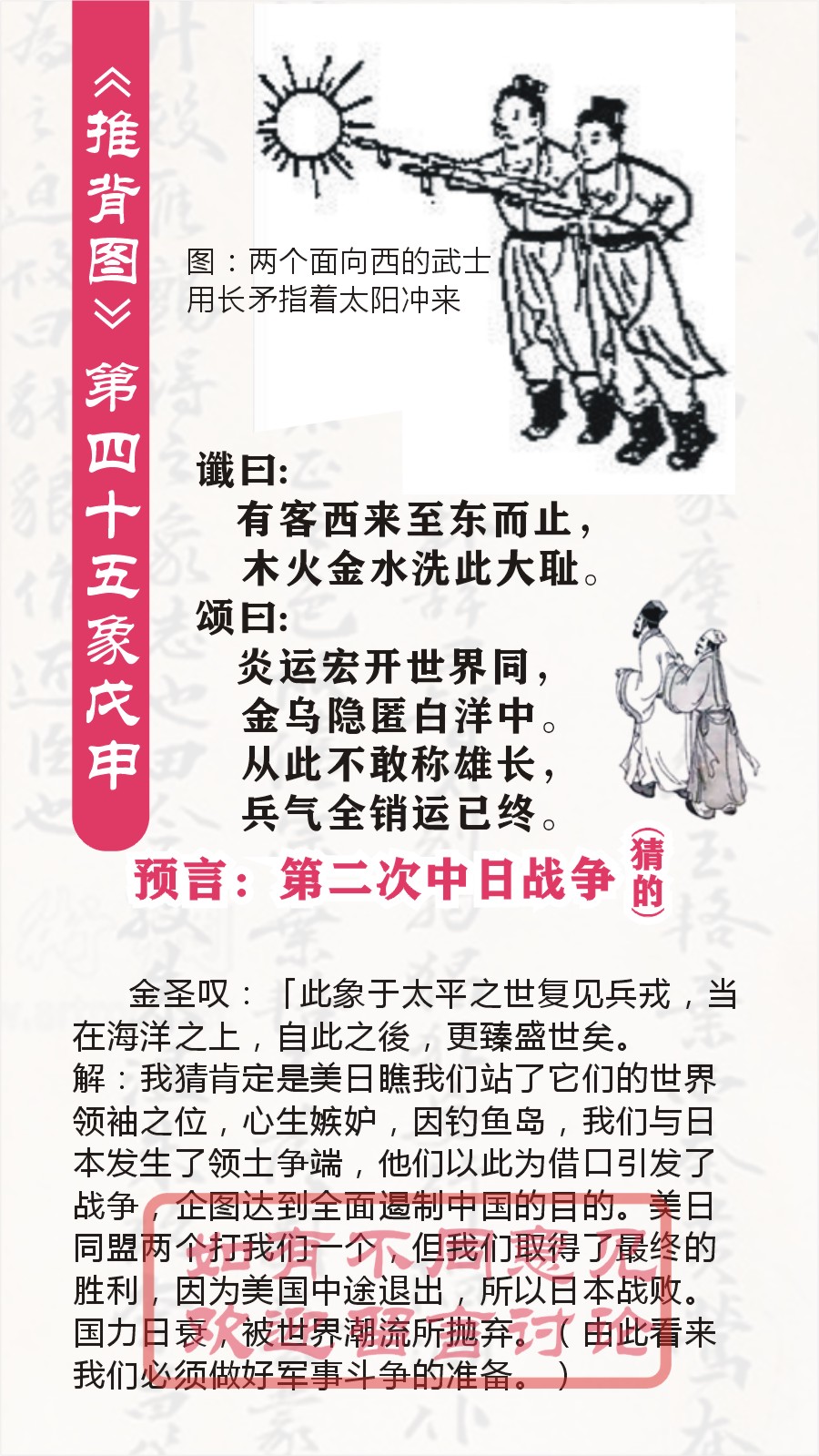 第四十五象戊申(中日再战) 图:两个面向西的武士用长矛指着太阳冲来 谶曰: 有客西来至东而止,木火金水洗此大耻。 颂曰: 炎运宏开世界同,金乌隐匿白洋中。 从此不敢称雄长,兵气全销运已终。 第四十五象:戊申。坎下艮上,山水蒙卦。预言第二次中日战争(猜的,欢迎讨论)。 以下是对《推背图》第四十五象的解读,要再次明确的是,《推背图》属于带有神秘色彩且解读极具主观性的古籍,其所谓“预言”并无科学依据来验证,仅可从文化研究、了解古人思维角度作为参考探讨内容: 卦象解读 “戊申”对应的卦象有着传统易学层面所蕴含的阴阳消长、事物发展变化等象征意义,可能预示着一种充满变动、冲突以及后续会迎来新秩序调整的局势状态,不过这只是基于卦象理论基础上的大致推测,具体理解因人而异且存在多种解读可能性。 谶语解读 有客西来至东而止: 从方位描述来看,“西来”通常可被理解为从西边而来的势力,结合历史背景等联想,容易让人想到日本(日本位于中国东边,相对西边而来)。“至东而止”意味着这股来自西边的势力来到东边地区(可指代来到中国周边或东亚区域等)后停下,有一种来势汹汹但最终被阻挡、停滞的意味,暗示了可能发生的冲突以及其最终的结局。 木火金水洗此大耻: “木火金水”涉及到传统五行元素,表意比较隐晦神秘,一种解读思路是其象征着不同的时间、阶段或者多种因素综合作用,寓意着通过一系列复杂的过程、事件以及各种力量的汇聚(关联到五行相关寓意的事物或情况)来洗刷曾经遭受的耻辱,或许暗指中国与日本之间历史上存在的过往纠葛(比如日本侵华带来的伤痛等),会凭借一些方式、契机来一雪前耻,不过具体所指很难确切定论。 颂语解读 炎运宏开世界同: “炎运”可象征着火一般热烈、蓬勃的运势,意味着一种积极、强大且具有广泛影响力的发展运势开启,“世界同”体现出这种运势影响范围是全球性的,可推测是在暗示中国在经历相关事件后,运势大开,并且其影响力能在世界范围内产生共鸣、获得认可,有一种站在世界舞台发挥重要作用且与世界共同发展的感觉。 金乌隐匿白洋中: “金乌”常指代太阳,也常象征日本(因日本国旗图案等关联),“隐匿”表示隐藏、消失,“白洋”可理解为海洋(比如周边的太平洋等),整体意思是日本的影响力、嚣张气焰等如同太阳落入海洋般消失不见,寓意着日本在这次事件后失去了以往那种称雄、逞强的资本,变得不再有威胁性。 从此不敢称雄长,兵气全销运已终: 进一步强调日本经过此次情况后,再也不敢妄图称霸、逞强了,其军事上的嚣张气焰(“兵气”)完全消散,运势也走到尽头,意味着日本会因为这次与中国相关的冲突或者局势变化而彻底衰落,失去原有的优势和对外扩张等不良企图,呈现出一种中国在冲突中取胜、日本走向衰败的画面推测,但这都是基于对文本解读的主观联想。 我们必须以理性客观的态度看待《推背图》中的这类内容,切不可盲目迷信其所谓“预言”,而对于中日关系,现实中两国都在努力通过和平友好交流、对话合作等方式来促进双边关系健康稳定发展,推动地区乃至世界的和平与繁荣,历史的伤痛让我们更应珍惜和平,通过积极的方式去构建友好的国际关系。 金圣叹:「此象于太平之世复见兵戎,当在海洋之上,自此之後,更臻盛世矣。 解:我猜肯定是美日瞧我们站了它们的世界领袖之位,心生嫉妒,因钓鱼岛,我们与日本发生了领土争端,他们以此为借口引发了战争,企图达到全面遏制中国的目的。美日同盟两个打我们一个,但我们取得了最终的胜利,因为美国中途退出,所以日本战败。国力日衰,被世界潮流所抛弃。(由此看来我们必须做好军事斗争的准备。) “有客西来,至东而止”,所谓客就是非敌非友,且是从西往东来。我想很有可能就是指美国。美国既想遏制中国又要避免与中国发生正面冲突,所以并没有完全介入中日冲突,所以说美国还算是客而非敌,为了维护美日同盟关系,美国总要过来一下装装样子,隔岸观火坐收渔利,最终是声势大而雨点小,这就叫“有客西来,至东而止”。日本没有了美国的帮助,离败亡的日子就不远了。 我们再来看图,右边有两个武士持长矛指着左边高升的太阳冲过来(从世界地图上看,中国在左边,美日在右边)一定是美日同盟跨海而来,左边高升的太阳代表已如日中天的中国。如此才符合世界地图的方位。也更为符合实际情况,因为美日有同盟条约,所以我们必须做好打一场恶仗的准备。“木火金水”,五行缺土,一定是为了领土之争,最可能的是钓鱼岛争端了。“洗此大耻”,百年耻辱,一朝得洗。“炎运宏开世界同”,炎黄子孙中华文化在全世界弘扬开来,得到了全世界的认同,世界人民都支持我们,人气在我们这一边。“金乌隐匿白洋中”,金乌,古时对太阳的称呼,如果日本膏药旗,没了太阳,自然成了白旗,淹没于白浪滔天的太平洋中了。说明日本投降了。“从此不敢称雄长,兵气全销运已终”,日本再也不敢有野心了,没了军队(估计连自卫队也没有了),国运从此衰落。气数已尽!被世界潮流所抛弃! 第1象:(唐朝)甲子 乾下乾上 乾 第2象:(唐朝)乙丑巽下乾上姤(预言武则天称帝) 第3象:(唐朝)丙寅艮下乾上遯(预言武则天造字曌) 第4象:(唐朝)丁卯坤下乾上否(预言张柬之夺回李唐政权) 第5象:(唐朝)戊辰坤下巽上观(预言
