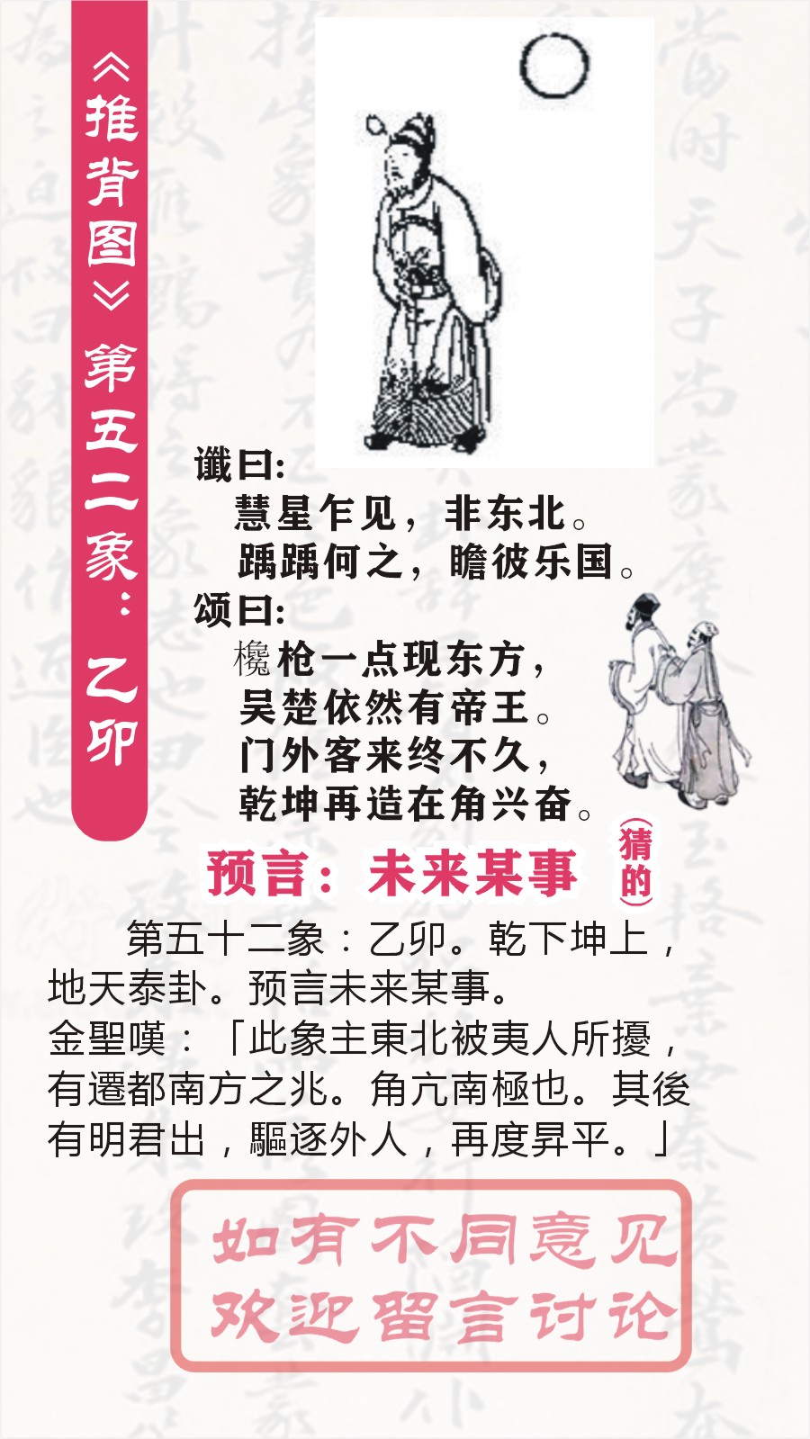 讖曰: 慧星乍見,不利東北。 踽踽何之,瞻彼樂國。 頌曰: 欃槍一點現東方,吳楚依然有帝王。 門外客來終不久,乾坤再造在角亢。 第五十二象:乙卯。乾下坤上,地天泰卦。预言未来某事。 以下是对《推背图》第五十二象的解读,要牢记《推背图》是带有神秘色彩且解读主观性很强的古籍,其所谓“预言”并无科学依据来证实,仅能作为从文化研究、探究古人思维角度的参考材料: 卦象解读 “乙卯乾下坤上泰”,泰卦象征着通泰、吉祥,意味着阴阳交感,上下互通,是一种顺畅、和谐且预示着事物能够良好发展的卦象。乾为天在下,坤为地在上,呈现出天地交合、地气上升、天气下降的状态,象征着一种融洽、有序且充满生机的大环境,为该象所描述的内容营造出一种看似整体局势有积极变化趋势、能平稳向好发展的氛围。 谶语解读 慧星乍見,不利東北: “慧星乍見”在古代常被视为一种不祥的天象,预示着将会有不好的事情发生。“不利東北”明确指出了方位,意味着东北方向可能会遭遇一些不利情况、面临危机或者出现动荡等,不过具体所指很难确切定论,也许是暗示在某个特定时期,东北地区会陷入到困难的局势当中,可能涉及战乱、灾害或者其他影响稳定的因素。 踽踽何之,瞻彼樂國: “踽踽”形容孤单的样子,描绘出一个人孤独地前行,不知要去往何处的状态,体现出一种迷茫、无助的感觉。“瞻彼樂國”则表示这个人在迷茫中向往、注视着某个被视为安乐、美好的国度,或许象征着当时的人们处于困境之中,渴望寻找到一个能让他们安居乐业、摆脱苦难的理想之地,反映出局势动荡下普通民众对安定生活的期盼。 颂语解读 欃槍一點現東方,吳楚依然有帝王: “欃槍一點現東方”中“欃槍”常被视作一种灾星,这里说在东方出现,同样营造出一种不祥的氛围,暗示东方地区将会出现一些引发动荡、带来灾祸的因素,比如可能是有势力崛起、战乱爆发等情况。“吳楚依然有帝王”表意较为隐晦,“吴楚”是古代的地域名称,在这里提到其依然有帝王,也许意味着在相应的地域会出现有着类似帝王般影响力、统治力的人物或势力,不过这与当时的时代背景脱离后很难确切知晓其具体所指,可能象征着局部地区出现特殊的权力格局变化。 門外客來終不久,乾坤再造在角亢: “門外客來終不久”给人一种外来者到访但停留时间不长的感觉,可能暗指外部势力介入某个局势,但最终无法长久维持其影响力,很快就会离去或者失去对局势的掌控。“乾坤再造在角亢”非常神秘隐晦,“角亢”是二十八星宿中的星宿名称,从古代天文与人事对应的观念来看,可能象征着在特定的天象对应的时间、方位等条件下,将会迎来重大的局势变革,重新塑造天地间的秩序(乾坤再造),意味着会有翻天覆地的变化发生,不过具体关联到何种实际情况很难精准判断。 总之,我们要以理性客观的态度看待《推背图》里的这些内容,把它当作了解古代文化、古人对天象与人事关联等思维方式的一种参考,避免盲目迷信其所谓“预言”,真实的历史发展是基于众多现实因素共同作用的结果。 金聖嘆:「此象主東北被夷人所擾,有遷都南方之兆。角亢南極也。其後有明君出,驅逐外人,再度昇平。」 第1象:(唐朝)甲子 乾下乾上 乾 第2象:(唐朝)乙丑巽下乾上姤(预言武则天称帝) 第3象:(唐朝)丙寅艮下乾上遯(预言武则天造字曌) 第4象:(唐朝)丁卯坤下乾上否(预言张柬之夺回李唐政权) 第5象:(唐朝)戊辰坤下巽上观(预言杨贵妃死于安史之乱) 第6象:(唐朝)已巳坤下艮上剥(预言郭子仪重振大唐) 第7象:(唐朝)庚午震下乾上无妄(吐番部落入寇中原) 第8象:(唐朝)辛未坤下离上晋(李希烈祸乱大唐) 第9象:(唐朝)壬申乾下离上大有(预言黄巢起义) 第10象:(五代)癸酉坎下坎上坎(预言朱温篡唐) 第11象:(五代)申戍兑下坎上节(戏子皇帝后唐庄宗之死) 第12象:(五代)乙亥震下坎上屯(石敬塘割让幽州) 第13象:(五代)丙子离下坎上既济(后周郭威君临天下) 第14象:(五代)丁丑离下兑上革(预言五代终结) 第15象:(北宋)戊寅离下震上丰(宋太祖扫荡群雄) 第16象:(北宋)已卯离下坤上明夷(赵匡胤一统天下) 第17象:(北宋)庚辰坎下坤上师(宋真宗亲征澶渊) 第18象:(北宋)辛巳艮下艮上艮(预言北宋太后刘娥“垂帘听政”) 第19象:(北宋)壬午离下艮上贲(王安石变法) 第20象:(北宋)癸未离下乾上同人(预言蔡京乱政) 第21象:(南宋)甲申兑下艮上损(预言靖康之耻) 第22象:(南宋)乙酉兑下离上睽(康王泥马渡江) 第23象:(南宋)丙戍兑下乾上履(预言蒙古崛起) 第24象:(南宋)丁亥兑下巽上中孚(预言南宋灭亡) 第25象:(元朝)戊子艮下巽上渐(预言元朝国运传10帝) 第26象:(元朝)已丑震下震上震(预言元朝灭亡) 第27象:(明朝)庚寅乾下震上豫(预言明朝开国) 第28象:(明朝)辛卯坎下震上解(预言朱棣篡位) 第29象:(明朝)壬辰巽下震上恒(预言明朝仁宣之治) 第30象:(明朝)癸巳巽下坤上升(预言土木堡之变) 第31象:(明朝)甲午离下巽上家人(预言魏忠贤之乱) 第32象:(明朝)乙未巽下坎上井(预言闯王李自成灭明) 第33象:(清朝)丙申巽下兑上大过(预言清兵入关,传十帝) 第34象:(清朝)丁酉巽下巽上巽(太平天国的预言) 第35象:(清朝)戊戍震下兑上随(火烧圆明园的预言) 第36象:(清朝)己亥乾下巽上小畜(慈喜逃到西安的预言) 第37象:(民国)庚子震下巽上益(建立中华民国的预言) 第38象:(民国)辛
