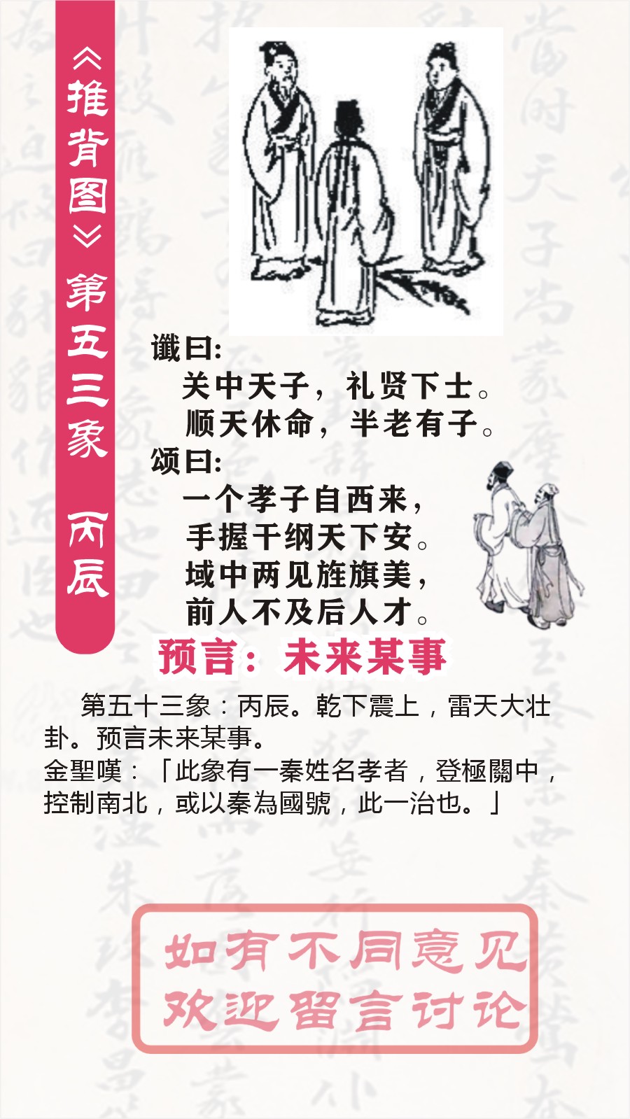 讖曰: 關中天子,禮賢下士。 順天休命,半老有子。 頌曰: 一個孝子自西來,手握乾綱天下安。 域中兩見旌旗美,前人不及後人才。 第五十三象:丙辰。乾下震上,雷天大壮卦。预言未来某事。 以下是对《推背图》第五十三象的解读,需明确的是,《推背图》充满神秘色彩且解读极具主观性,其所谓“预言”并无科学依据可验证,仅可作为文化研究、了解古人思维角度的参考探讨内容: 卦象解读 “丙辰乾下震上大壮”,大壮卦象征着壮大、强盛之意,意味着事物处于蓬勃发展、力量不断积聚且呈现出阳刚、进取的态势。乾为天在下,震为雷在上,雷在天上轰鸣,气势恢宏,象征着一种强大且积极向上的力量,预示着这一象所描述的情境有着积极发展、势力壮大的趋势,会展现出充满活力与冲劲的局面。 谶语解读 关中天子,礼贤下士: “关中”在历史上是一个重要的地域概念,大致位于今陕西中部地区,有着深厚的历史底蕴和重要的战略地位。“关中天子”指称来自关中地区的统治者,暗示此地将会出现一位有着统治地位的关键人物。“礼贤下士”则体现出这位统治者的品德与治国之道,说明他尊重有才能的人,能够放下身段去招揽、礼遇贤才,凭借这种良好的用人态度来汇聚各方智慧与力量,为其统治和事业发展奠定基础。 顺天休命,半老有子: “顺天休命”强调其行事遵循天命、顺应上天所赋予的美好使命,意味着这位统治者的作为是符合天道、顺应时势的,行事有着正当性与合理性,能够得到上天的眷顾,顺利地开展统治工作。“半老有子”表意较隐晦,一种理解是这位统治者在年事已高或者已到人生一定阶段时,有了子嗣,或许象征着后继有人,其家族、统治能够得以延续传承,不过具体所指较难确切定论,可看作是对其家族、统治层面一种情况的暗示。 颂语解读 一个孝子自西来,手握乾纲天下安: “一个孝子自西来”从方位上点明是从西边而来的人物,“孝子”形象可能寓意着此人品德上注重孝道等传统美德,同时结合其从西而来的描述,可推测其有着特定的地域背景或者来路。“手握乾纲”表示此人掌握着统治大权,能够掌控天下局势,凭借手中的权力使得天下呈现出安定祥和的状态,说明他有较强的统治能力,通过有力的治理让国家走向安稳,凸显其在稳定局势方面的关键作用。 域中两见旌旗美,前人不及后人才: “域中两见旌旗美”营造出一种在其统治地域内,能看到两面(或许象征不同的势力、群体等,但不一定是确指数量为二)漂亮的旌旗,意味着国内有着不同的力量展现出良好的风貌,呈现出一种繁荣、有序且富有活力的场景,不同的势力、群体等都在有序发展且相互辉映。“前人不及后人才”则是对人才层面的一种评价,强调后来出现的人才更为优秀,可能暗示在这位统治者治理期间,涌现出了比以往更出色的人才,这些人才为国家的进一步发展提供了有力支持,也从侧面反映出当时有着良好的人才发展环境和积极向上的发展态势。 我们应当以理性客观的态度看待《推背图》此类内容,把它作为了解古代文化、古人对理想统治者形象以及国家良好发展状态设想等思维的一种参考资料,避免过度迷信以及牵强附会地去对应具体历史事件或现实情况。 金聖嘆:「此象有一秦姓名孝者,登極關中,控制南北,或以秦為國號,此一治也。」 第1象:(唐朝)甲子 乾下乾上 乾 第2象:(唐朝)乙丑巽下乾上姤(预言武则天称帝) 第3象:(唐朝)丙寅艮下乾上遯(预言武则天造字曌) 第4象:(唐朝)丁卯坤下乾上否(预言张柬之夺回李唐政权) 第5象:(唐朝)戊辰坤下巽上观(预言杨贵妃死于安史之乱) 第6象:(唐朝)已巳坤下艮上剥(预言郭子仪重振大唐) 第7象:(唐朝)庚午震下乾上无妄(吐番部落入寇中原) 第8象:(唐朝)辛未坤下离上晋(李希烈祸乱大唐) 第9象:(唐朝)壬申乾下离上大有(预言黄巢起义) 第10象:(五代)癸酉坎下坎上坎(预言朱温篡唐) 第11象:(五代)申戍兑下坎上节(戏子皇帝后唐庄宗之死) 第12象:(五代)乙亥震下坎上屯(石敬塘割让幽州) 第13象:(五代)丙子离下坎上既济(后周郭威君临天下) 第14象:(五代)丁丑离下兑上革(预言五代终结) 第15象:(北宋)戊寅离下震上丰(宋太祖扫荡群雄) 第16象:(北宋)已卯离下坤上明夷(赵匡胤一统天下) 第17象:(北宋)庚辰坎下坤上师(宋真宗亲征澶渊) 第18象:(北宋)辛巳艮下艮上艮(预言北宋太后刘娥“垂帘听政”) 第19象:(北宋)壬午离下艮上贲(王安石变法) 第20象:(北宋)癸未离下乾上同人(预言蔡京乱政) 第21象:(南宋)甲申兑下艮上损(预言靖康之耻) 第22象:(南宋)乙酉兑下离上睽(康王泥马渡江) 第23象:(南宋)丙戍兑下乾上履(预言蒙古崛起) 第24象:(南宋)丁亥兑下巽上中孚(预言南宋灭亡) 第25象:(元朝)戊子艮下巽上渐(预言元朝国运传10帝) 第26象:(元朝)已丑震下震上震(预言元朝灭亡) 第27象:(明朝)庚寅乾下震上豫(预言明朝开国) 第28象:(明朝)辛卯坎下震上解(预言朱棣篡位) 第29象:(明朝)壬辰巽下震上恒(预言明朝仁宣之治) 第30象:(明朝)癸巳巽下坤上升(预言土木堡之变) 第31象:(明朝)甲午离下巽上家人(预言魏忠贤之乱) 第32象:(明朝)乙未巽下坎上井(预言闯王李自成灭明) 第33象:(清朝)丙申巽下兑上大过(预言清兵入关,传十帝) 第34象:(清朝)丁酉巽下巽上巽(太平天国的预言) 第35象:(清朝)戊戍震下兑上随(火烧圆明园的预言) 第36象:(清朝)己亥乾下巽上小畜(慈喜逃到西安