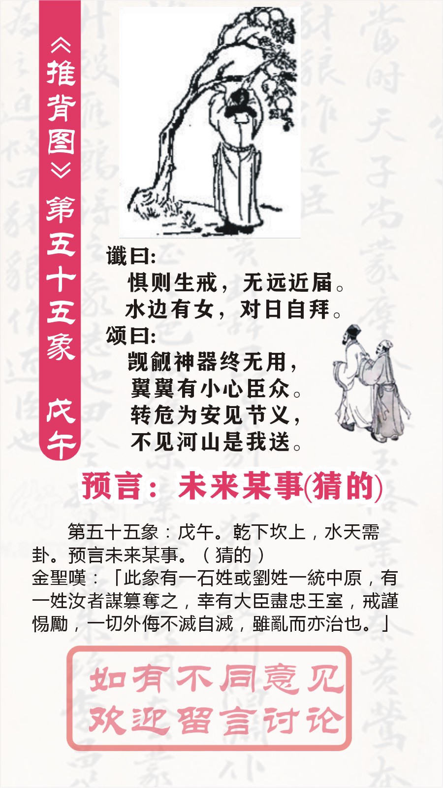 讖曰: 懼則生戒,無遠勿屆。 水邊有女,對日自拜。 頌曰: 覬覦神器終無用,翼翼小心有臣眾。 轉危為安見節義,未必河山是我送。 第五十五象:戊午。乾下坎上,水天需卦。预言未来某事。(猜的) 以下是对《推背图》第五十五象的解读,需明确的是,《推背图》是一部充满神秘色彩且解读主观性较强的古籍,其所谓“预言”并无科学依据来证实,仅可作为研究古代文化、了解古人思维角度的参考内容: 卦象解读 “戊午乾下坎上需”,需卦象征等待、需要,有事物发展过程中要耐心等待时机、积聚力量,以满足所需、达成目标之意。乾为天在下,坎为水在上,犹如天上有云,水汽积聚,还未化成雨落下,意味着当下的局势正处在一种积蓄、酝酿的阶段,需要耐心等待合适的条件出现才能进一步有所行动,为该象所描述的内容营造出一种待机而动、蕴含变化的氛围。 谶语解读 惧则生戒,无远勿届: “惧则生戒”体现出一种因有所畏惧而产生警戒心理的状态,意味着人们或者相关势力面对某种情况、威胁时,会变得谨慎,从而设立防范措施。“无远勿届”意思是不管多远的地方都能到达,这里可能暗示不管潜在的威胁来自何处,哪怕距离很远,都能被感知到并纳入警戒范围之内,整体反映出一种警惕性较高、防御意识较强的局面,也许是在面临外部挑战等情况下的一种应对姿态。 水边有女,对日自拜: “水边有女”从字面表意来看,描述了一个特定的场景和人物所在位置,比较形象直观,但也较为隐晦神秘,可能暗指与水相关地域出现的一位女性角色,其有着特殊意义或在后续局势发展中起到关键作用。“对日自拜”描绘出这个女子对着太阳进行参拜的行为,太阳在古代常象征着权威、神圣等,这一动作或许象征着她对某种强大力量的尊崇、臣服,或者有着借助太阳所代表的力量来达成自身目的的意味,不过具体所指很难确切定论,给人留下诸多想象空间。 颂语解读 觊觎神器终无用,翼翼小心有臣众: “觊觎神器”中“神器”在古代常指代皇位、王权等象征最高统治权力的事物,意味着有人心怀不轨,妄图谋取最高权力,但“终无用”表明这种企图最终是不会得逞的,体现出对这种不正当权力欲望的否定。“翼翼小心有臣众”则描绘出在相应局势下,存在着众多臣子小心翼翼、谨慎行事的状态,可能暗示当时有着复杂的朝堂局势或者权力斗争环境,大臣们为了维持稳定、避免灾祸而处处谨慎,从侧面反映出整体局势的微妙与紧张。 转危为安见节义,未必河山是我送: “转危为安”表达出一种局势从危险向安全转变的良好预期,说明在经历一番波折、面临危机之后,能够凭借一些因素(也许是众人坚守的节义等)使情况好转,化险为夷。“未必河山是我送”则有一种坚守国土、不愿轻易放弃的意味,体现出一种捍卫国家主权、领土完整的决心,暗示即便面临困难、威胁,也不会轻易将大好河山拱手相让,展现出一种爱国情怀和对国家命运的担当,反映出在复杂局势中人们对国家稳定和主权的重视。 我们应当以理性客观的态度看待《推背图》此类内容,把它作为了解古代文化、古人对权力斗争、国家安危等方面思维的一种参考资料,避免过度迷信以及牵强附会地去对应具体历史事件或现实情况。 金聖嘆:「此象有一石姓或劉姓一統中原,有一姓汝者謀篡奪之,幸有大臣盡忠王室,戒謹惕勵,一切外侮不滅自滅,雖亂而亦治也。」 第1象:(唐朝)甲子 乾下乾上 乾 第2象:(唐朝)乙丑巽下乾上姤(预言武则天称帝) 第3象:(唐朝)丙寅艮下乾上遯(预言武则天造字曌) 第4象:(唐朝)丁卯坤下乾上否(预言张柬之夺回李唐政权) 第5象:(唐朝)戊辰坤下巽上观(预言杨贵妃死于安史之乱) 第6象:(唐朝)已巳坤下艮上剥(预言郭子仪重振大唐) 第7象:(唐朝)庚午震下乾上无妄(吐番部落入寇中原) 第8象:(唐朝)辛未坤下离上晋(李希烈祸乱大唐) 第9象:(唐朝)壬申乾下离上大有(预言黄巢起义) 第10象:(五代)癸酉坎下坎上坎(预言朱温篡唐) 第11象:(五代)申戍兑下坎上节(戏子皇帝后唐庄宗之死) 第12象:(五代)乙亥震下坎上屯(石敬塘割让幽州) 第13象:(五代)丙子离下坎上既济(后周郭威君临天下) 第14象:(五代)丁丑离下兑上革(预言五代终结) 第15象:(北宋)戊寅离下震上丰(宋太祖扫荡群雄) 第16象:(北宋)已卯离下坤上明夷(赵匡胤一统天下) 第17象:(北宋)庚辰坎下坤上师(宋真宗亲征澶渊) 第18象:(北宋)辛巳艮下艮上艮(预言北宋太后刘娥“垂帘听政”) 第19象:(北宋)壬午离下艮上贲(王安石变法) 第20象:(北宋)癸未离下乾上同人(预言蔡京乱政) 第21象:(南宋)甲申兑下艮上损(预言靖康之耻) 第22象:(南宋)乙酉兑下离上睽(康王泥马渡江) 第23象:(南宋)丙戍兑下乾上履(预言蒙古崛起) 第24象:(南宋)丁亥兑下巽上中孚(预言南宋灭亡) 第25象:(元朝)戊子艮下巽上渐(预言元朝国运传10帝) 第26象:(元朝)已丑震下震上震(预言元朝灭亡) 第27象:(明朝)庚寅乾下震上豫(预言明朝开国) 第28象:(明朝)辛卯坎下震上解(预言朱棣篡位) 第29象:(明朝)壬辰巽下震上恒(预言明朝仁宣之治) 第30象:(明朝)癸巳巽下坤上升(预言土木堡之变) 第31象:(明朝)甲午离下巽上家人(预言魏忠贤之乱) 第32象:(明朝)乙未巽下坎上井(预言闯王李自成灭明) 第33象:(清朝)丙申巽下兑上大过(预言清兵入关,传十帝) 第34象:(清朝)丁酉巽下巽上巽(太平天国的预言) 第35象:(清朝)戊戍震下兑上随(火