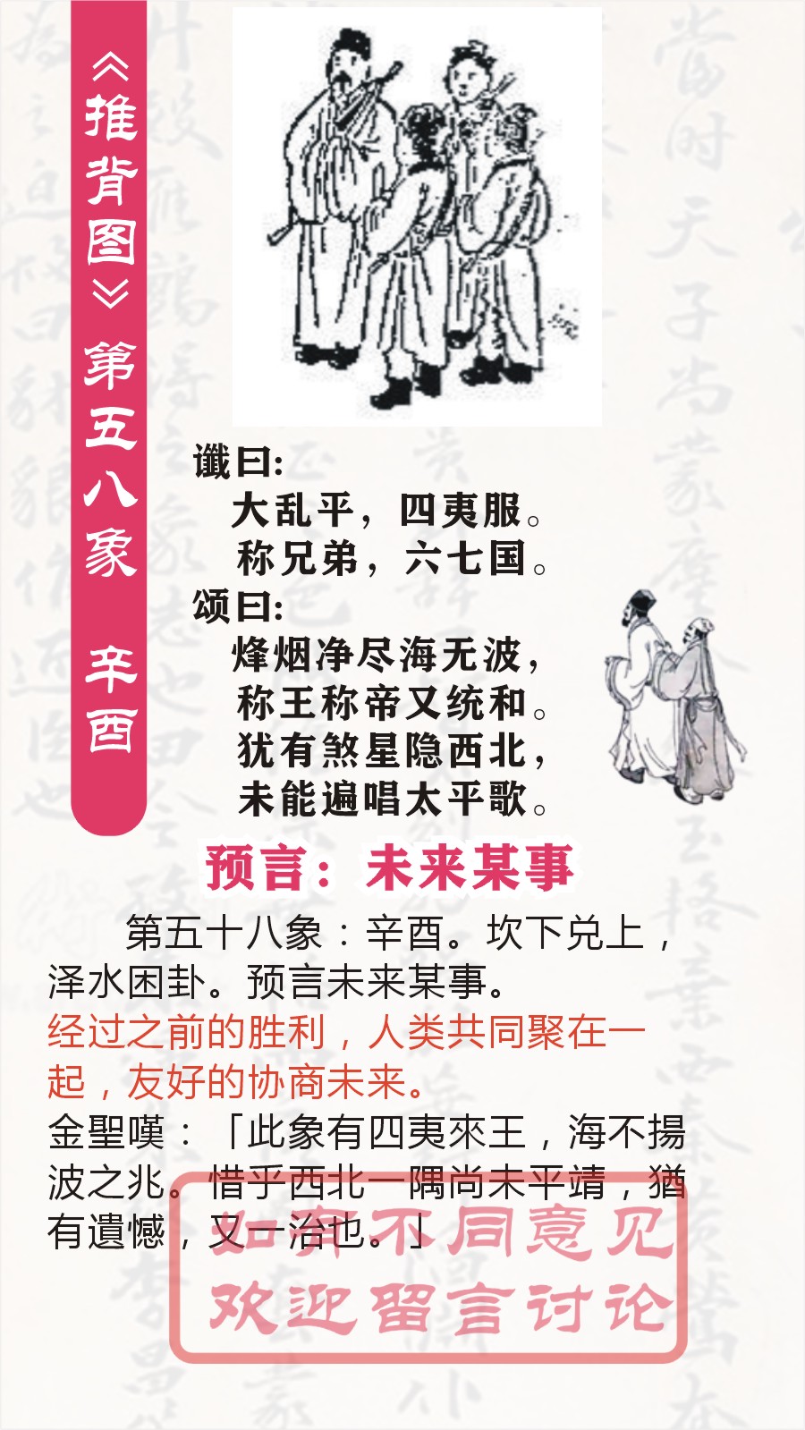 讖曰: 大亂平,四夷服。 稱兄弟,六七國。 頌曰: 烽煙淨盡海無波,稱王稱帝又統和。 猶有煞星隱西北,未能遍唱太平歌。 第五十八象:辛酉。坎下兑上,泽水困卦。预言未来某事。 以下是对《推背图》第五十八象的解读,不过要清楚《推背图》本身带有神秘色彩,解读往往具有很强的主观性,其所谓“预言”并无科学依据来验证,仅可作为从文化研究、了解古人思维角度的参考内容: 卦象解读 “辛酉坎下兑上困”,困卦象征着困窘、艰难之意,意味着事物陷入到一种受困、难以顺利发展的状态。坎为水在下,兑为泽在上,水在泽下,有泽水干涸、水源被困之象,就好像处于困境之中,资源、发展空间等受到限制。但从另一个角度看,困卦也提示人们要在困境中坚守正道、寻求突破,为这一象所描述的内容营造出一种先是经历艰难,而后有望打破困局、走向新发展的氛围。 谶语解读 大乱平,四夷服: “大乱平”直白地表明此前存在着大规模的混乱局势,比如可能是战乱、社会动荡等情况,而后这些混乱被平息了下来,意味着局势从动荡不安转向了稳定有序。“四夷服”则体现出在大乱平定之后,周边的各个外族(四夷在古代常指代周边不同的民族或国家)都表示臣服,呈现出一种天下归心、周边势力认可并归顺的局面,暗示着国家或核心势力在平定内乱后展现出强大的影响力和统治力,使得外部势力折服。 称兄弟,六七国: “称兄弟”描绘出一种比较友好、平等的关系状态,意味着与周边大约“六七国”(这里的“六七”可能是概数,指代多个国家)建立起了类似兄弟般亲密、友好的关系,不再是以往那种等级分明或者充满对抗的国际关系,体现出一种和平友好、相互协作的国际交往氛围,反映出在大乱平定后对外关系上呈现出的和谐状态。 颂语解读 烽烟净尽海无波: 形象地描绘出一种和平的景象,“烽烟”象征着战争、战乱,“烽烟净尽”表示战争完全停止了,硝烟散尽。“海无波”则进一步强调不仅陆地,连海上也没有了波澜,也就是没有了海上的纷争、战乱等情况,意味着整个世界无论是陆地还是海洋都处于和平稳定的状态,展现出大乱之后所迎来的理想的和平环境。 称王称帝又统和: 这句话表意有些复杂,“称王称帝”让人联想到过去的封建统治称号,在这里可能是一种象征手法,也许意味着在新的和平局势下,出现了有着强大影响力、类似王者般的领导力量,或者是不同的势力群体在新秩序下有着各自的重要地位。“又统和”强调在这样的情况下依然能够实现统一与和谐,说明尽管存在不同的势力、称号等情况,但整体上还是达成了一种团结协作、共同发展的和谐局面,实现了统合的状态。 犹有煞星隐西北,未能遍唱太平歌: “犹有煞星隐西北”营造出一种潜在危险的氛围,“煞星”通常象征着带来灾祸、不利影响的因素,“隐西北”指出其隐藏在西北方位,意味着尽管整体局势趋于和平稳定了,但在西北方向还潜藏着一些隐患、不安定的因素,可能随时会对当前的和平局面造成威胁。“未能遍唱太平歌”则进一步强调因为存在这样的潜在威胁,所以还不能完全毫无顾忌地庆祝太平,说明和平的状态还不够彻底,仍需要保持警惕,应对可能出现的危机,反映出局势虽好但尚存隐忧的情况。 我们要以理性客观的态度看待《推背图》里的这些内容,把它当作了解古代文化、古人对治乱兴衰以及国际关系等方面思维的一种参考资料,避免过度迷信其所谓“预言”,真实的历史发展是由众多现实因素共同作用的结果。 金聖嘆:「此象有四夷來王,海不揚波之兆。惜乎西北一隅尚未平靖,猶有遺憾,又一治也。」 第1象:(唐朝)甲子 乾下乾上 乾 第2象:(唐朝)乙丑巽下乾上姤(预言武则天称帝) 第3象:(唐朝)丙寅艮下乾上遯(预言武则天造字曌) 第4象:(唐朝)丁卯坤下乾上否(预言张柬之夺回李唐政权) 第5象:(唐朝)戊辰坤下巽上观(预言杨贵妃死于安史之乱) 第6象:(唐朝)已巳坤下艮上剥(预言郭子仪重振大唐) 第7象:(唐朝)庚午震下乾上无妄(吐番部落入寇中原) 第8象:(唐朝)辛未坤下离上晋(李希烈祸乱大唐) 第9象:(唐朝)壬申乾下离上大有(预言黄巢起义) 第10象:(五代)癸酉坎下坎上坎(预言朱温篡唐) 第11象:(五代)申戍兑下坎上节(戏子皇帝后唐庄宗之死) 第12象:(五代)乙亥震下坎上屯(石敬塘割让幽州) 第13象:(五代)丙子离下坎上既济(后周郭威君临天下) 第14象:(五代)丁丑离下兑上革(预言五代终结) 第15象:(北宋)戊寅离下震上丰(宋太祖扫荡群雄) 第16象:(北宋)已卯离下坤上明夷(赵匡胤一统天下) 第17象:(北宋)庚辰坎下坤上师(宋真宗亲征澶渊) 第18象:(北宋)辛巳艮下艮上艮(预言北宋太后刘娥“垂帘听政”) 第19象:(北宋)壬午离下艮上贲(王安石变法) 第20象:(北宋)癸未离下乾上同人(预言蔡京乱政) 第21象:(南宋)甲申兑下艮上损(预言靖康之耻) 第22象:(南宋)乙酉兑下离上睽(康王泥马渡江) 第23象:(南宋)丙戍兑下乾上履(预言蒙古崛起) 第24象:(南宋)丁亥兑下巽上中孚(预言南宋灭亡) 第25象:(元朝)戊子艮下巽上渐(预言元朝国运传10帝) 第26象:(元朝)已丑震下震上震(预言元朝灭亡) 第27象:(明朝)庚寅乾下震上豫(预言明朝开国) 第28象:(明朝)辛卯坎下震上解(预言朱棣篡位) 第29象:(明朝)壬辰巽下震上恒(预言明朝仁宣之治) 第30象:(明朝)癸巳巽下坤上升(预言土木堡之变) 第31象:(明朝)甲午离下巽上家人(预言魏忠