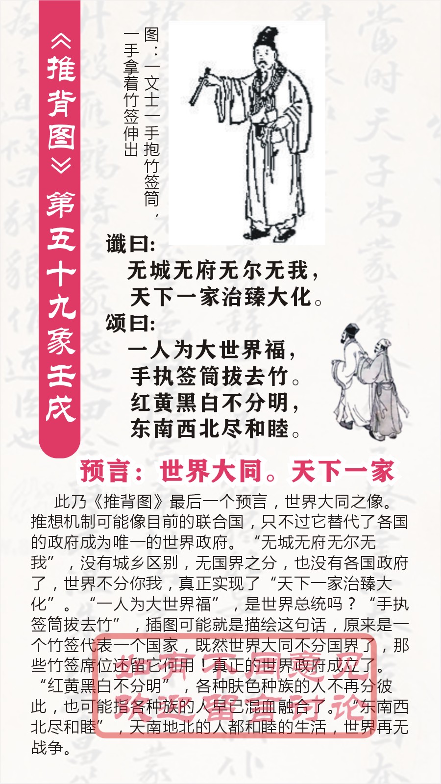 第五十九象壬戌(《推背图》最后一个预言:世界大同之像) 图:一文士一手抱竹签筒,一手拿着竹签伸出 谶曰: 无城无府无尔无我, 天下一家治臻大化。 颂曰: 一人为大世界福,手执签筒拔去竹。 红黄黑白不分明,东南西北尽和睦。 第五十九象:壬戌。艮下兑上,泽山咸卦。预言世界大同。天下一家,治臻大化。《推背图》最后一个预言:世界大同之像 以下是对《推背图》第五十九象的解读,需明确的是,《推背图》充满神秘色彩且解读极具主观性,其所谓“预言”并无科学依据来验证,仅可作为文化研究、了解古人思维角度的参考内容: 卦象解读 虽然这里没有特别针对“壬戌”对应的卦象做详细阐释其蕴含的常规易理象征,但从传统易学角度看,其对应的卦象或许预示着一种终极、圆满的状态,事物发展到了一种和谐、融合且趋于极致稳定的阶段,为后续所描述的世界大同景象营造出一种理想、美好的氛围。 谶语解读 无城无府无尔无我: “无城无府”意味着打破了传统以城市、府衙等为界限划分区域、进行管理的模式,象征着地域界限变得模糊甚至消失,不再有那种基于地域区分而产生的隔阂与差异。“无尔无我”则体现出一种高度融合、不分彼此的人际关系,人们摒弃了自我与他人之间的分别心,消除了个体之间的对立与隔阂,达到了一种高度统一、和谐共生的状态,整体描绘出一种超越了现有社会结构与人际关系的理想画面,展现出世界大同下的极致融合感。 天下一家治臻大化: 强调整个世界就如同一个大家庭一样,所有的人都生活在这个大家庭之中,不分彼此。“治臻大化”表示治理达到了一种非常高的境界、极为理想的状态,意味着在这样的天下一家的环境里,管理方式、社会秩序等都达到了近乎完美的程度,实现了公平、有序且和谐的社会治理,反映出一种对理想世界治理模式的美好憧憬。 颂语解读 一人为大世界福,手执签筒拔去竹: “一人为大世界福”塑造出一个有着非凡影响力的关键人物形象,仿佛凭借这一个人的力量就能为整个世界带来福祉,让全世界的人都受益,或许象征着出现了一位极具智慧、品德高尚的引领者,通过其引领带动整个世界走向美好的大同境界。“手执签筒拔去竹”表意较为隐晦神秘,从字面看,签筒没了竹就剩下“筒”字,可能是一种象征手法,寓意去除多余的、不必要的部分,或者暗示通过某种特殊的行为、举动来简化、净化世界现有的复杂结构、规则等,使其向更纯粹、更利于达成世界大同的方向发展。 红黄黑白不分明,东南西北尽和睦: “红黄黑白”指代不同肤色的人种,意味着在世界大同的状态下,不再以肤色来区分人群,种族之间的差异不再被强调,人们摒弃了因肤色等外在因素产生的偏见与隔阂,真正实现了平等与融合。“东南西北”指代不同的地域方位,说明世界各地的人们无论来自何方,都能和睦相处,地域之间不存在纷争、矛盾,整个世界都处于一种和平、友好且和谐的状态,全方位地展现出世界大同所描绘的美好、融洽的理想景象。 我们应当以理性客观的态度看待《推背图》此类内容,把它作为了解古代文化、古人对未来世界美好愿景等思维的一种参考资料,避免过度迷信以及牵强附会地去对应具体历史事件或现实情况。《推背图》的这些描述更多是一种对理想状态的想象与期盼,而在现实中,人类也一直在通过和平交流、合作共赢等诸多方式朝着构建和谐世界、促进全球共同发展的方向不断努力。 金圣叹:「此乃太同之象,人生其际,饮和食德,当不知若何愉快也。惜乎其数已终,其或反本归原,还於混噩欤。」 解:此乃《推背图》最后一个预言,世界大同之像。推想机制可能像目前的联合国,只不过它替代了各国的政府成为唯一的世界政府。“无城无府无尔无我”,没有城乡区别,无国界之分,也没有各国政府了,世界不分你我,真正实现了“天下一家治臻大化”。“一人为大世界福”,是世界总统吗?“手执签筒拔去竹”,插图可能就是描绘这句话,原来是一个竹签代表一个国家,既然世界大同不分国界了,那些竹签席位还留它何用!真正的世界政府成立了。“红黄黑白不分明”,各种肤色种族的人不再分彼此,也可能指各种族的人早已混血融合了。“东南西北尽和睦”,天南地北的人都和睦的生活,世界再无战争。 第1象:(唐朝)甲子 乾下乾上 乾 第2象:(唐朝)乙丑巽下乾上姤(预言武则天称帝) 第3象:(唐朝)丙寅艮下乾上遯(预言武则天造字曌) 第4象:(唐朝)丁卯坤下乾上否(预言张柬之夺回李唐政权) 第5象:(唐朝)戊辰坤下巽上观(预言杨贵妃死于安史之乱) 第6象:(唐朝)已巳坤下艮上剥(预言郭子仪重振大唐) 第7象:(唐朝)庚午震下乾上无妄(吐番部落入寇中原) 第8象:(唐朝)辛未坤下离上晋(李希烈祸乱大唐) 第9象:(唐朝)壬申乾下离上大有(预言黄巢起义) 第10象:(五代)癸酉坎下坎上坎(预言朱温篡唐) 第11象:(五代)申戍兑下坎上节(戏子皇帝后唐庄宗之死) 第12象:(五代)乙亥震下坎上屯(石敬塘割让幽州) 第13象:(五代)丙子离下坎上既济(后周郭威君临天下) 第14象:(五代)丁丑离下兑上革(预言五代终结) 第15象:(北宋)戊寅离下震上丰(宋太祖扫荡群雄) 第16象:(北宋)已卯离下坤上明夷(赵匡胤一统天下) 第17象:(北宋)庚辰坎下坤上师(宋真宗亲征澶渊) 第18象:(北宋)辛巳艮下艮上艮(预言北宋太后刘娥“垂帘听政”) 第19象:(北宋)壬午