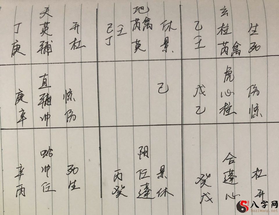 从意味着做生意的生门落在时干空亡的坤二宫(甲申旬空心午未)可判断并不是生意人,日干与开关门俱在外面盘,表明其工作中没有家乡(具体是外县人),辛日干以丙为其夫,丙落坎一宫休囚,又被日干宫所克,家里自然男权妻夺,月干意味着兄妹落离宫主兄妹三个,己在离宫旺地不以空,又生助日干所属的艮八宫,故断必得兄妹之助甚多。